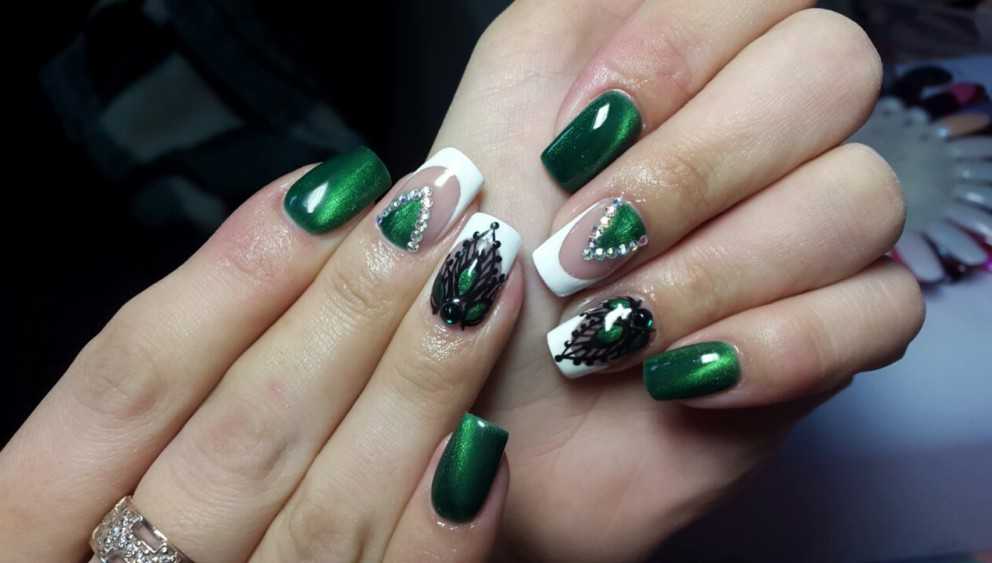 Зеленый цвет больше подходит для моделирования ногтей с покрытием «эффект рептилии». Идеально вписывается в стильные луки в неформальном направлении.