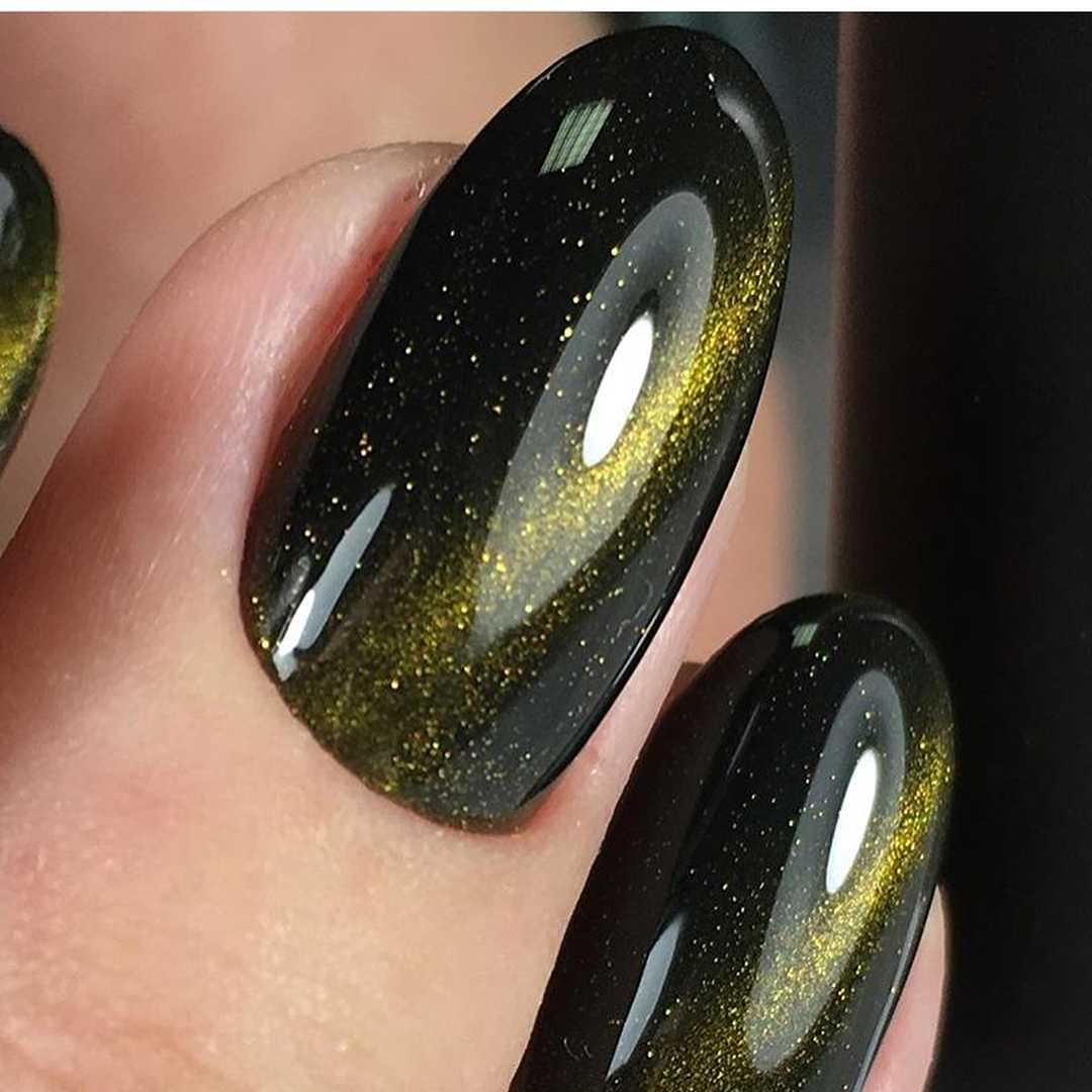 Производитель Masura подошел основательно к технике моделирования ногтей кошачий глаз. Он предложил мастерам новинку с использованием черной базы под покрытие. Данный способ оформления позволяет только один раз наносить металлические лаки с мерцающими частицами, что гарантирует идеальный, четкий рисунок и легкость в работе. Однако у производителя есть небольшой минус: необходимо действовать быстро, а то полоска мерцания будет нечеткой и размытой.