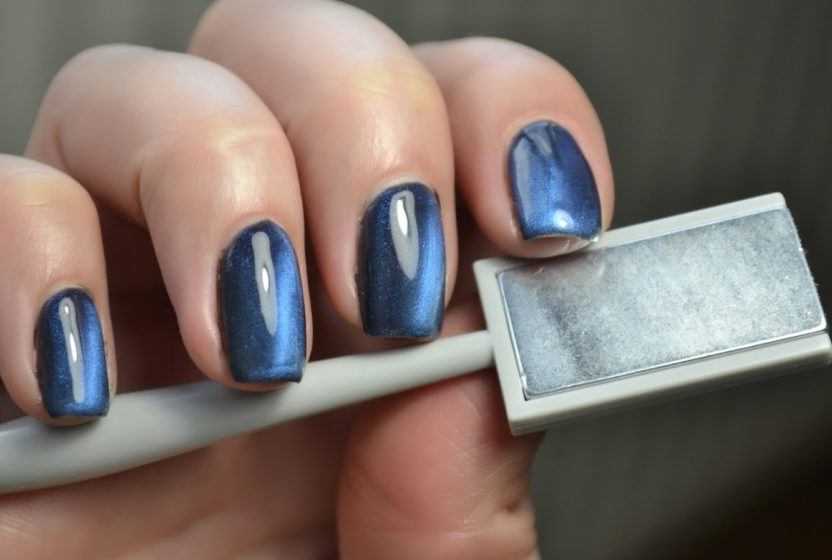- После нанесения лака поднесите к ногтевой пластине магнит, который позволит получить эффект кошачьего глаза.