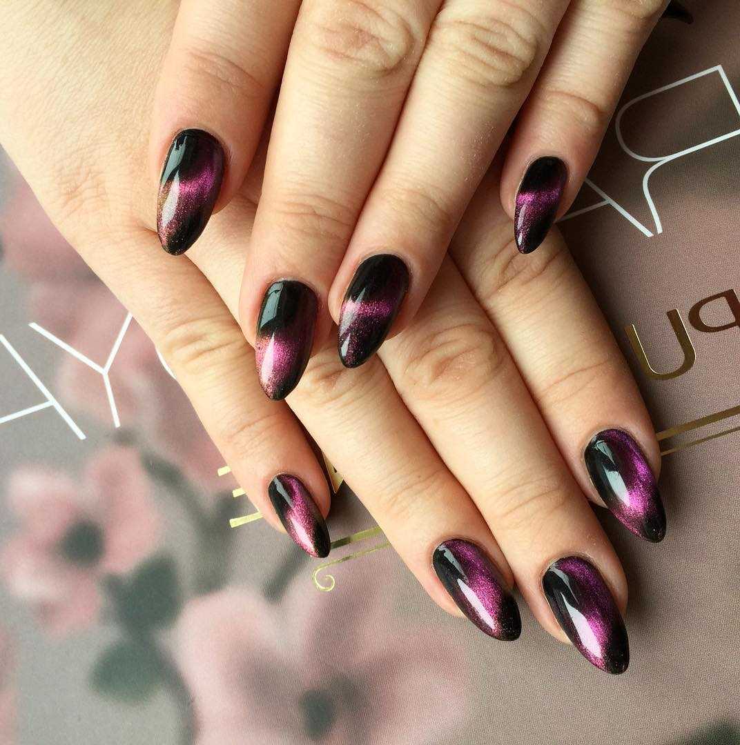 Черный колор с синим или бордовым бликом очаровывает своей глубиной. С помощью глянцевого топа мерцающий эффект усиливается, и ноготки выглядят великолепно.