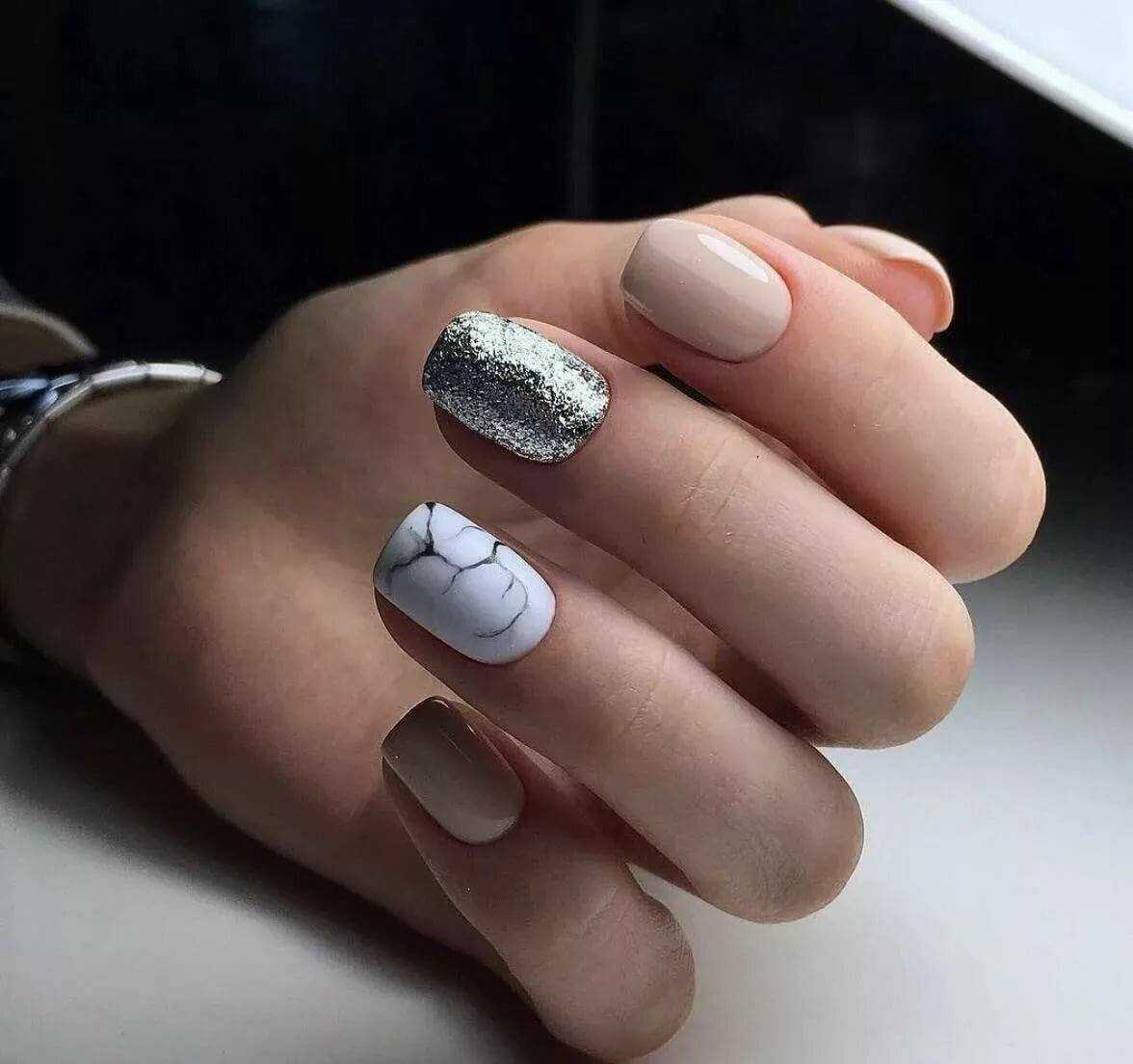 Очень модно в 2017 использовать в нейл-арте металлизированные лаки. Если хочется сделать стильный и милый маникюр для романтического свидания или вечером, можно взять спокойный нюдовый оттенок в качестве основы и совместить его с серебристым покрытием, выделить им лунки и полностью окрасить акцентные ноготки.