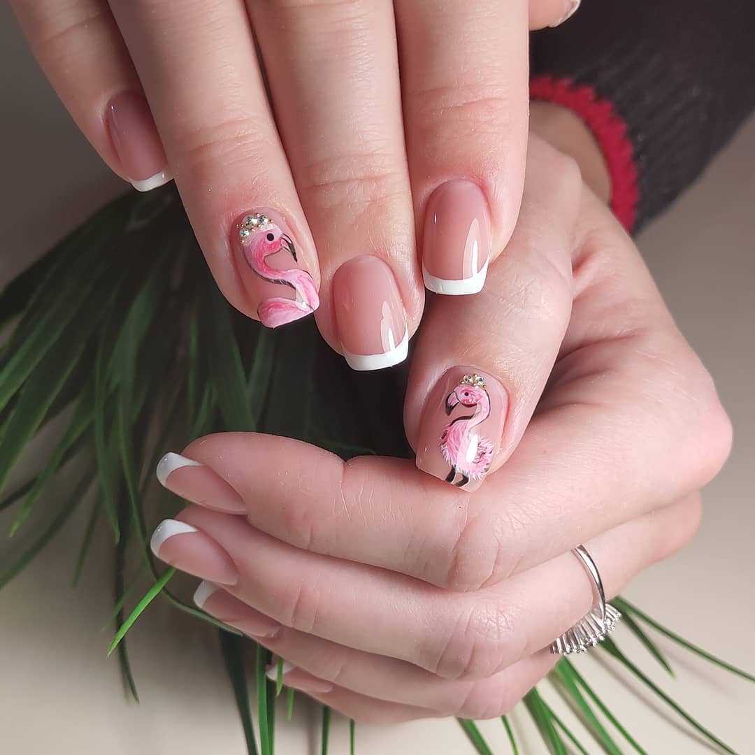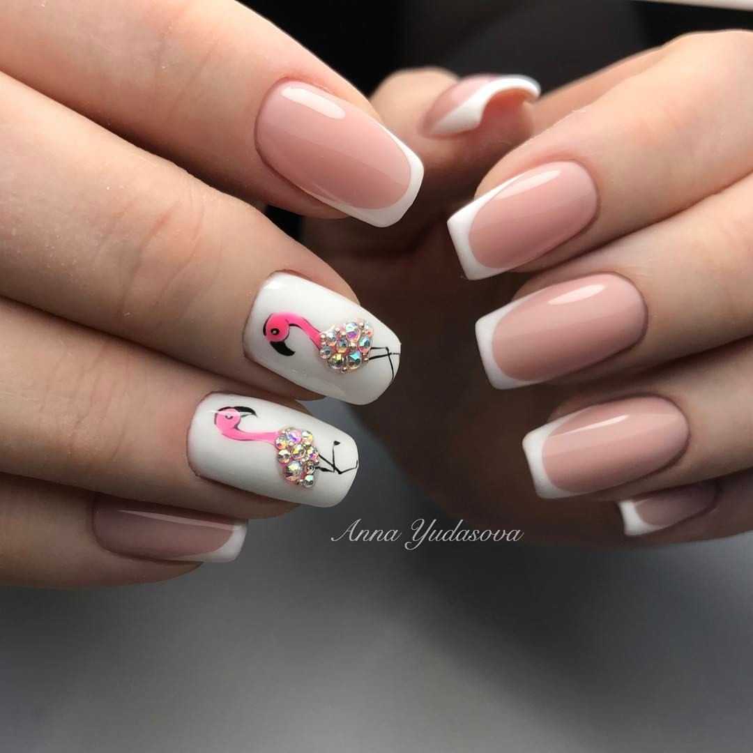 Женщины, которые тяготеют к классике, будут невообразимо рады искусному сочетанию французского маникюра и рисунка в виде фламинго. Подобный дизайн удачно дополнит как ваш повседневный образ, так вечерний и даже деловой. А что самое интересное, подобный маникюр славится тем, что дольше создает на ноготках эффект свежего маникюра.