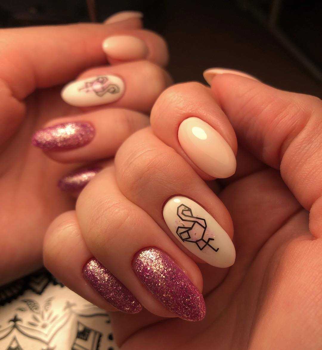 За счет того, что птицу в большинстве случаев выполняют розовым цветом, контрасты надлежит подбирать особо тщательно, чтобы основная идея дизайна не утратила свою выразительность. Поэтому разные дополнения принта необходимо дозировать, чтобы не перегрузить маникюр в целом и не лишить его высокого статуса.