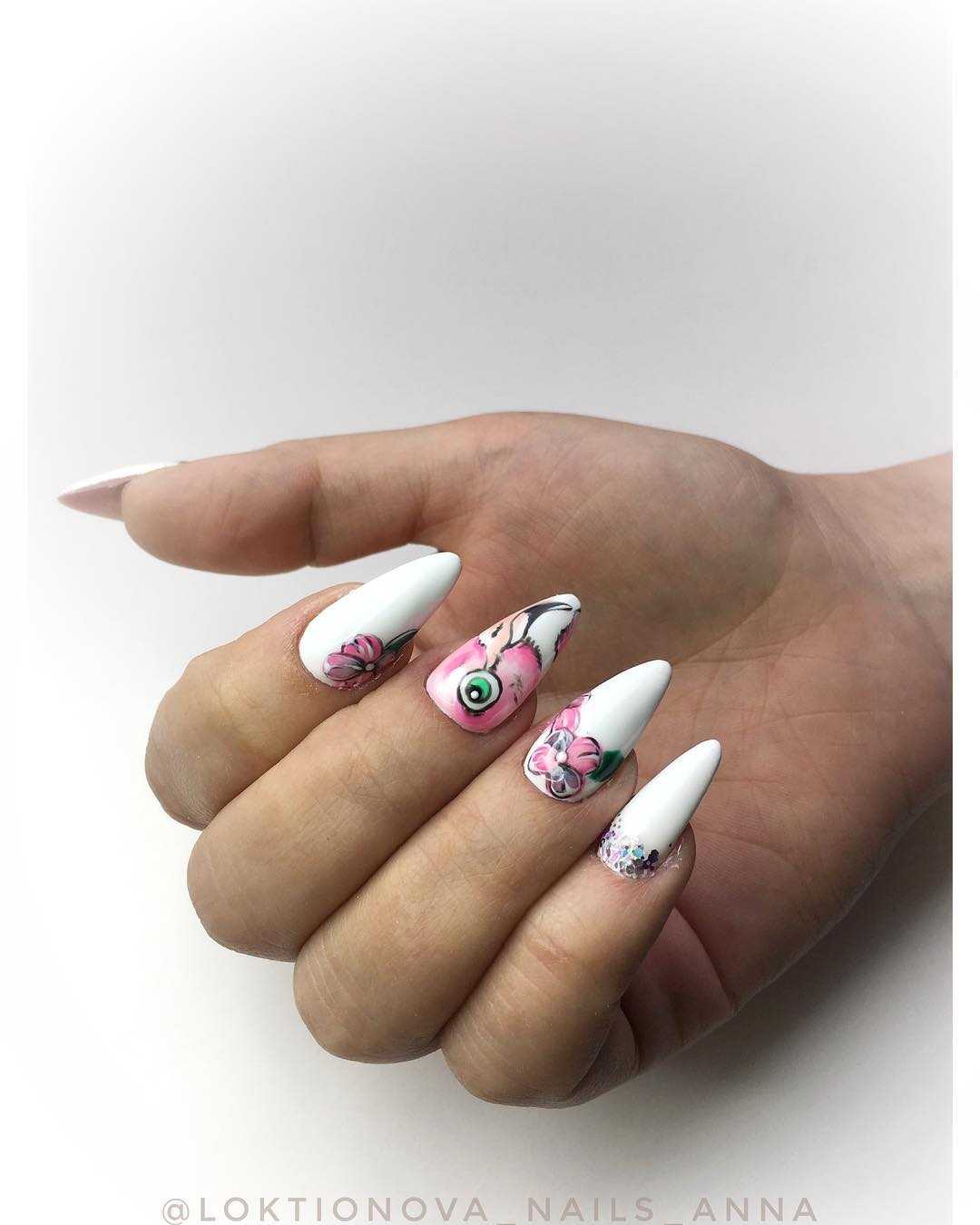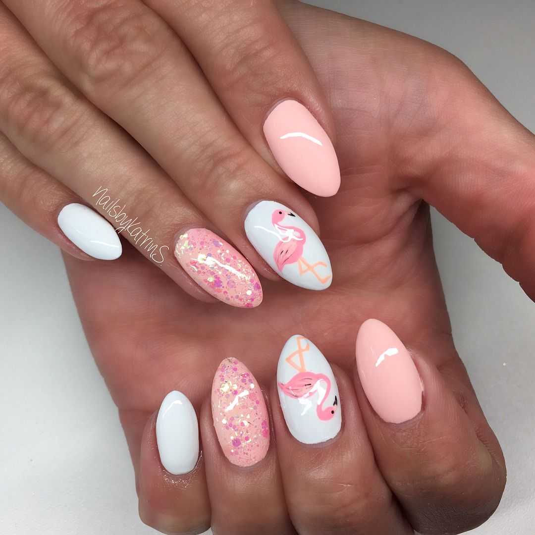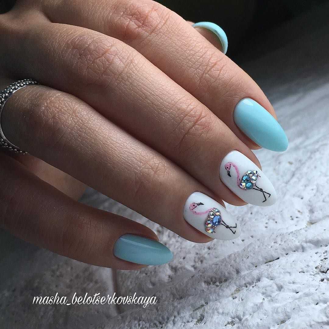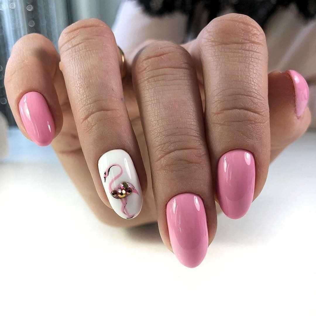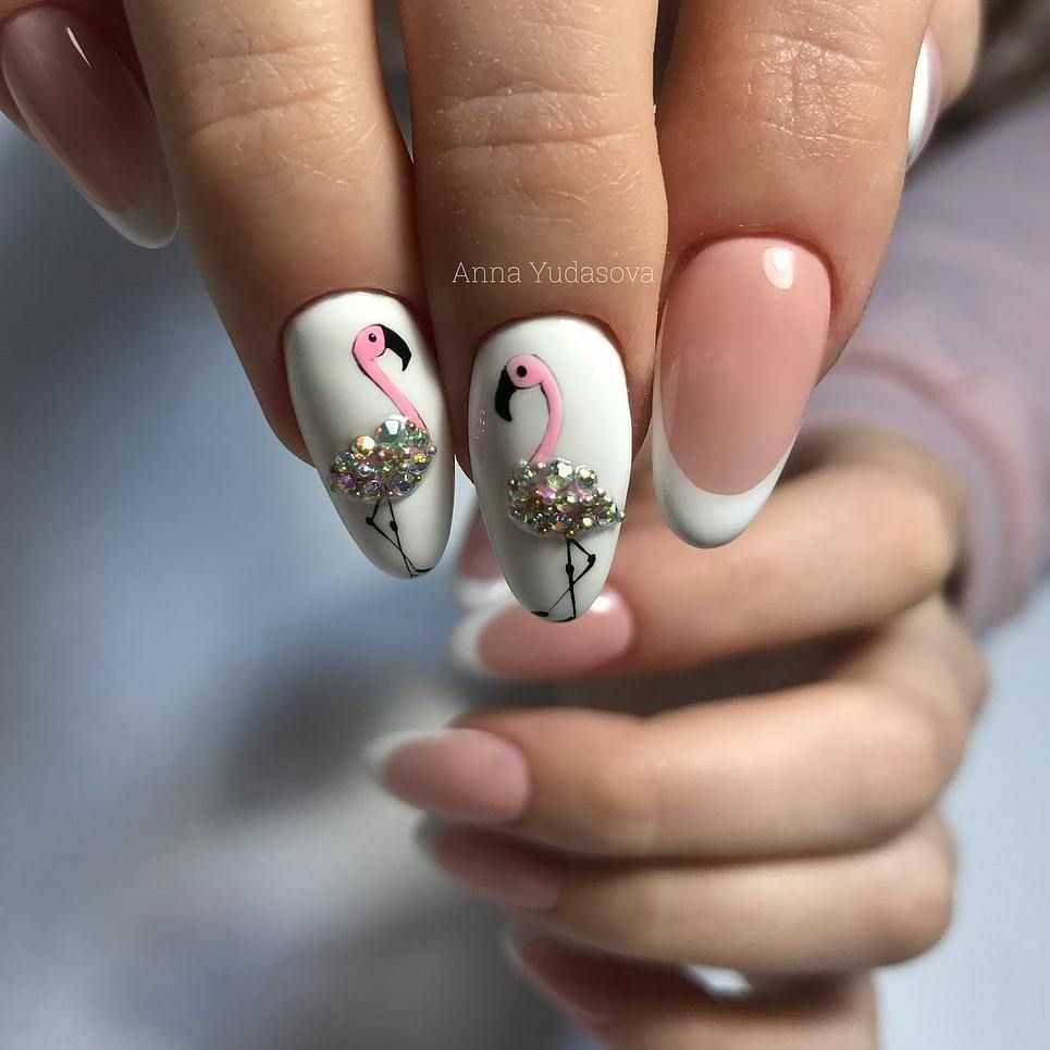 Если вы любите белый цвет, почему бы вам не использовать его в маникюре с фламинго? Чтобы нейл-арт не выглядел скучным, вы всегда его можете разбавить такими техниками, как френч, лунный или французский, омбре или negative space. А вот добавить очарования вашим ручкам поможет декор. Например, вы всегда можете попробовать беспроигрышное сочетание белого маникюра, рисунка фламинго и страз, фольги, скот-ленты, глиттера или бусин.
