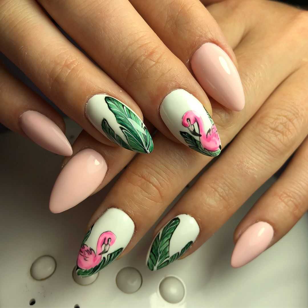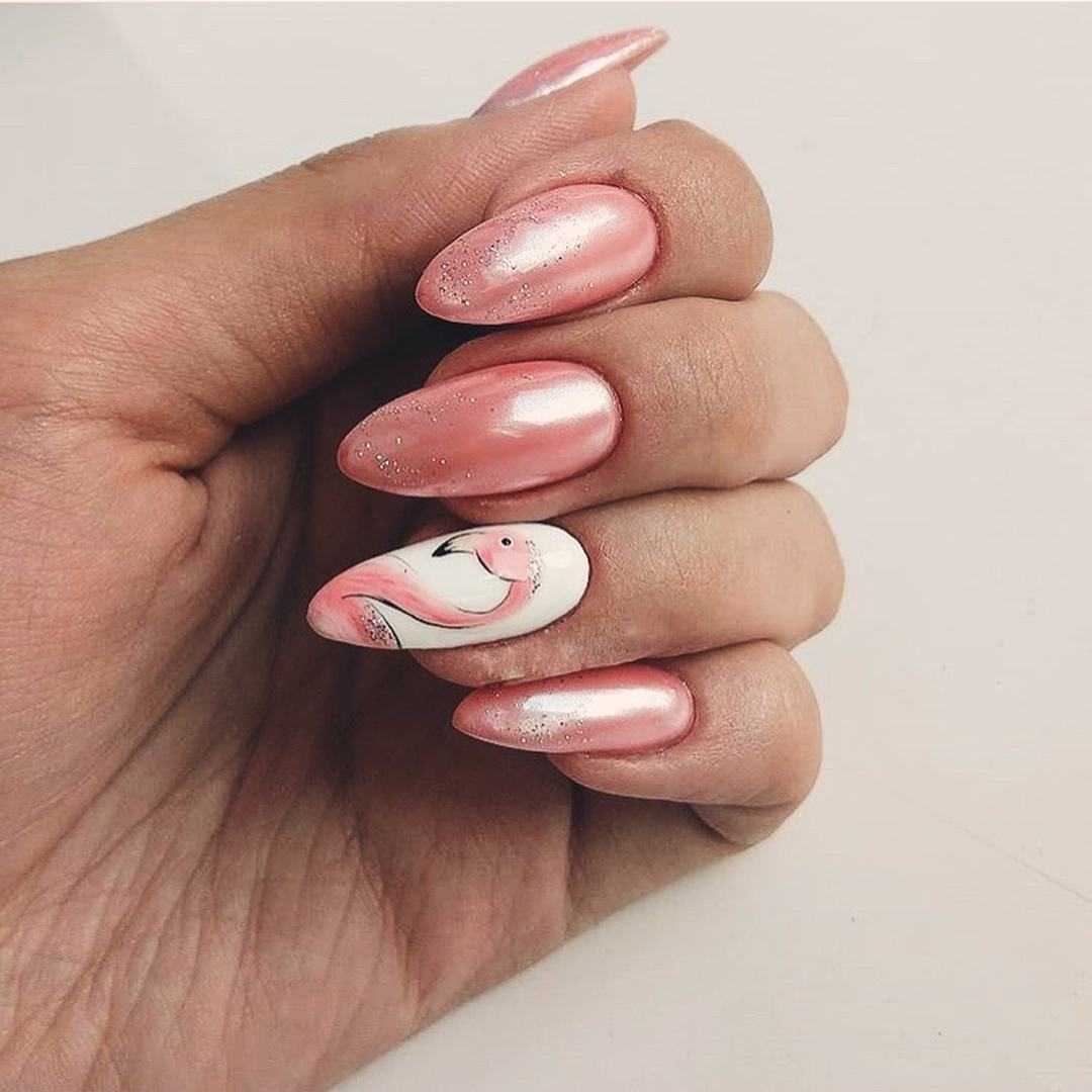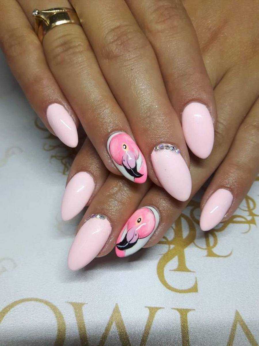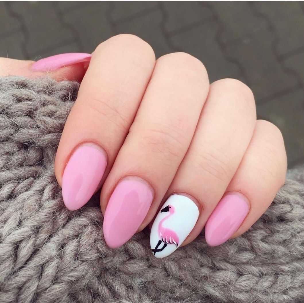 Чтобы фламинго была действительно украшением дизайна, нужны как минимум ногти средней длины. Конечно, если своя форма удлинена от природы, этого тоже может хватить для декорирования акцентных ногтевых пластин. Что касается спила, он может быть разным, например, полностью прямым, прямым со скругленными боками, слегка округлым, полукруглым. Единственное, что не годится для дизайна с фламинго – это форма ногтя в виде трапеции, при которой острый край спилен частично. Такая форма больше нуждается в геометрических тематиках, часть рисунка из-за нее может потеряться.