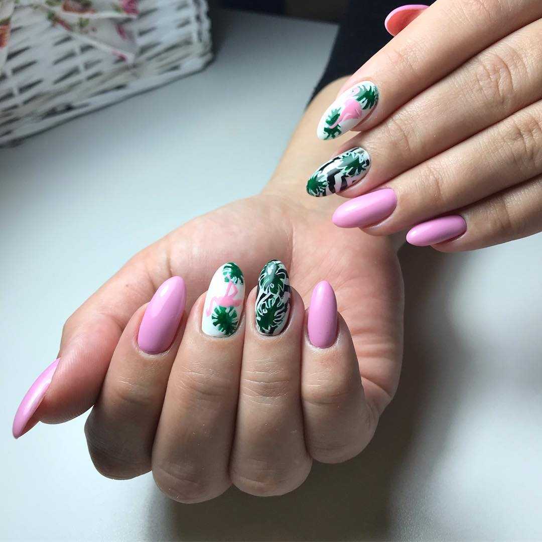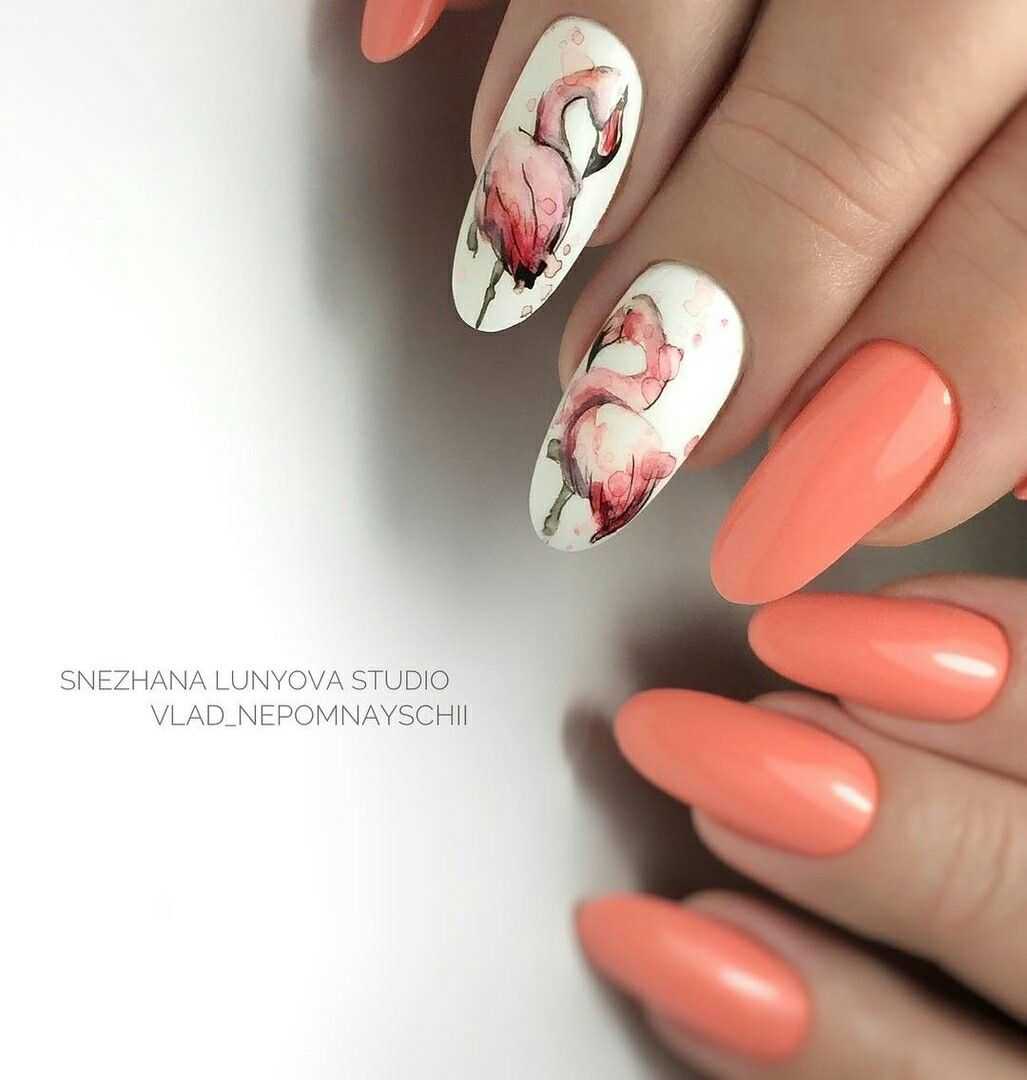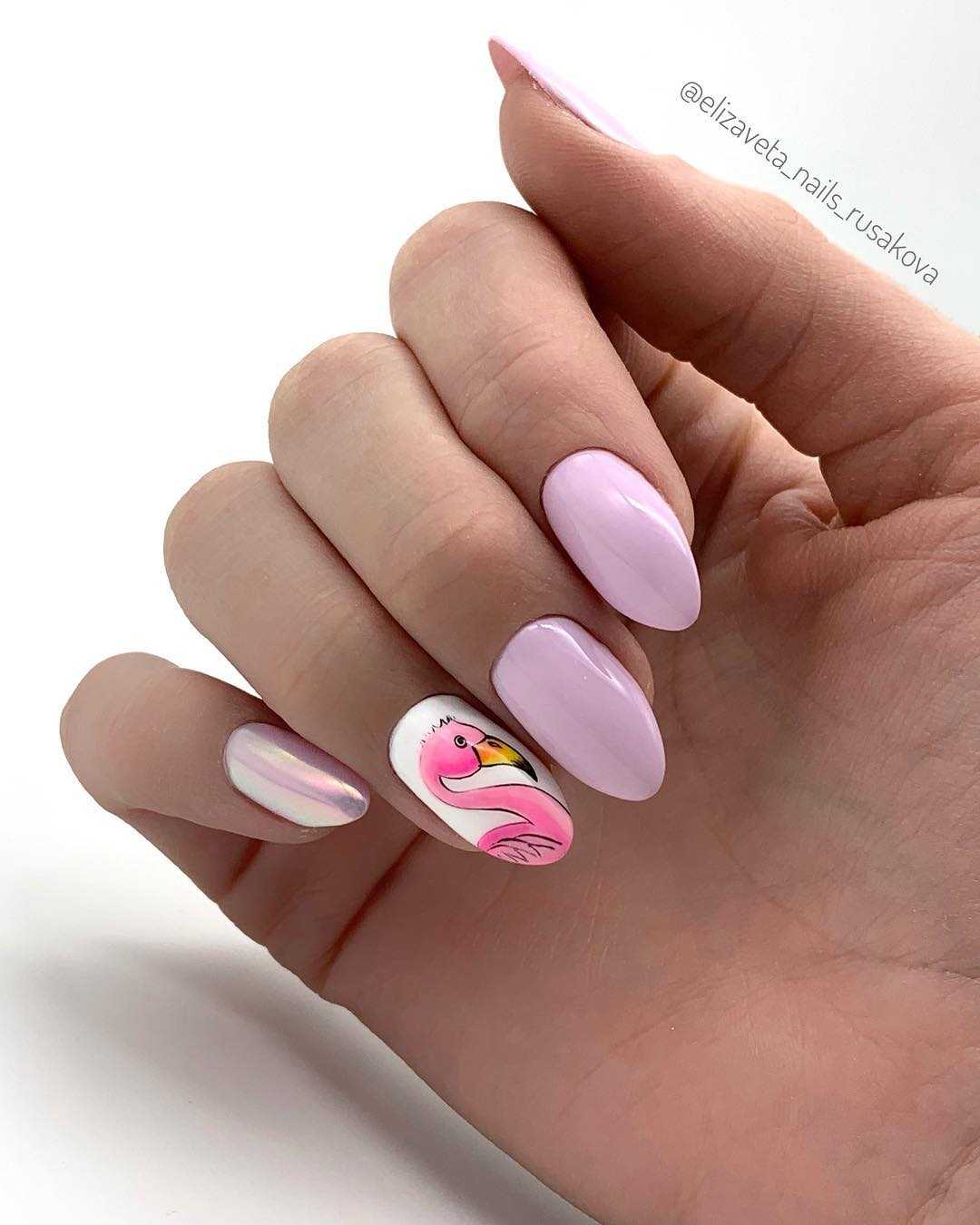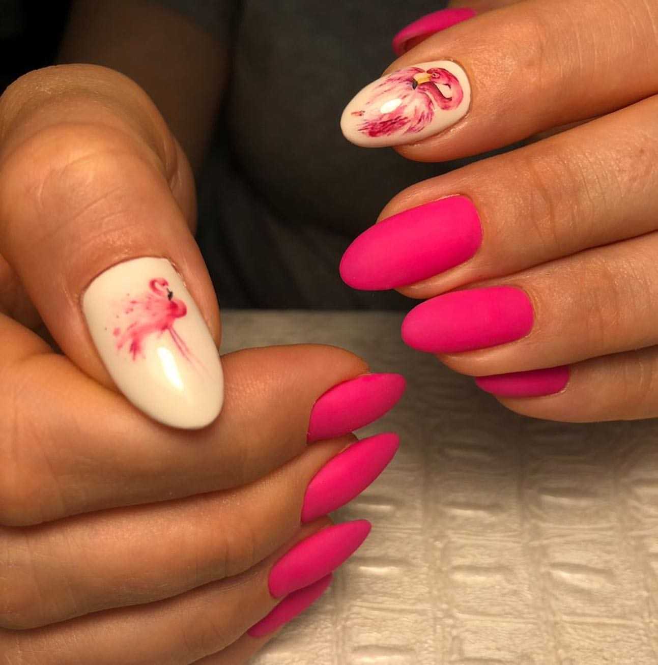 Чтобы фламинго была действительно украшением дизайна, нужны как минимум ногти средней длины. Конечно, если своя форма удлинена от природы, этого тоже может хватить для декорирования акцентных ногтевых пластин. Что касается спила, он может быть разным, например, полностью прямым, прямым со скругленными боками, слегка округлым, полукруглым. Единственное, что не годится для дизайна с фламинго – это форма ногтя в виде трапеции, при которой острый край спилен частично. Такая форма больше нуждается в геометрических тематиках, часть рисунка из-за нее может потеряться.