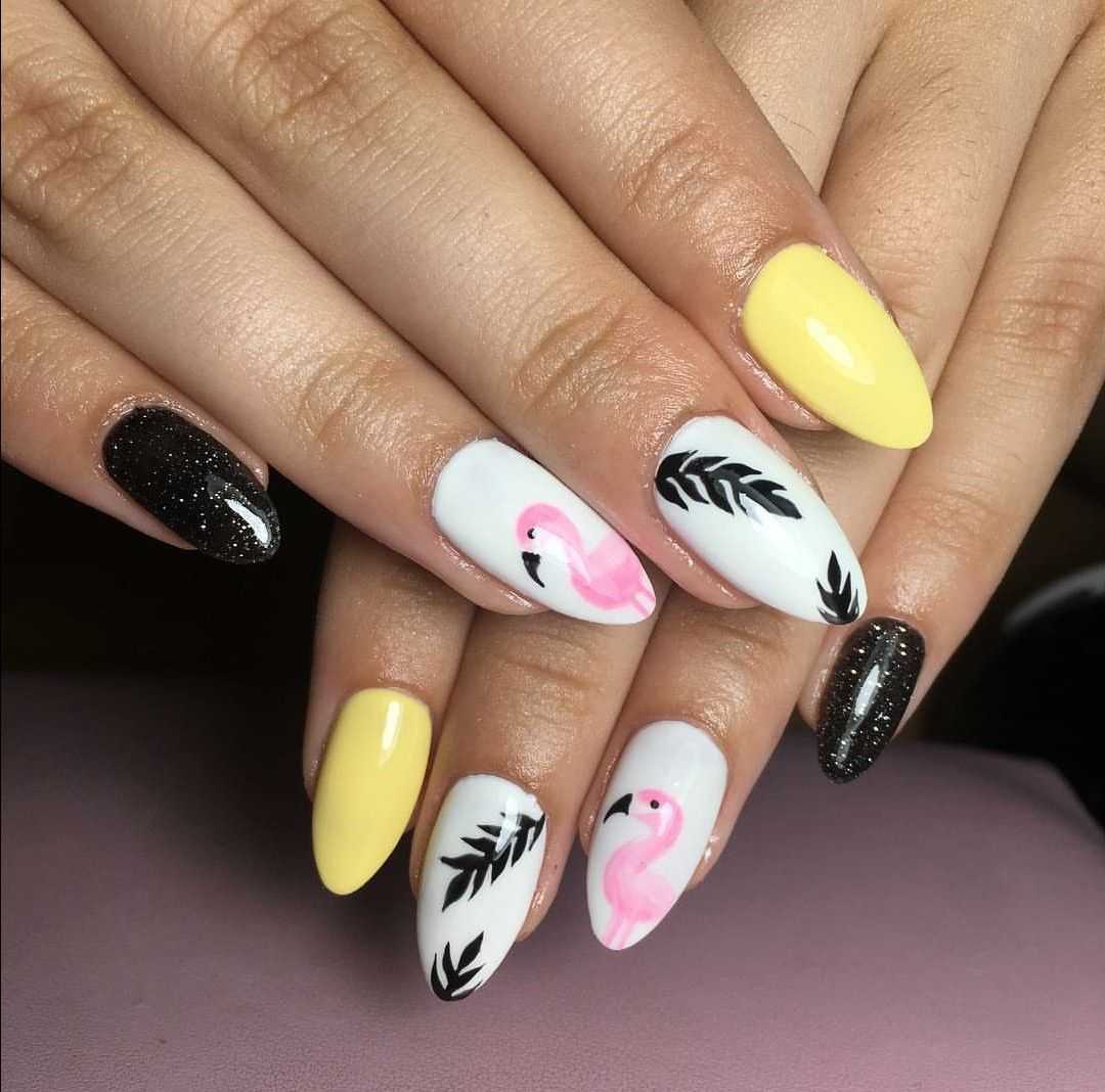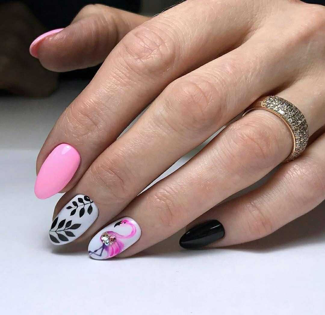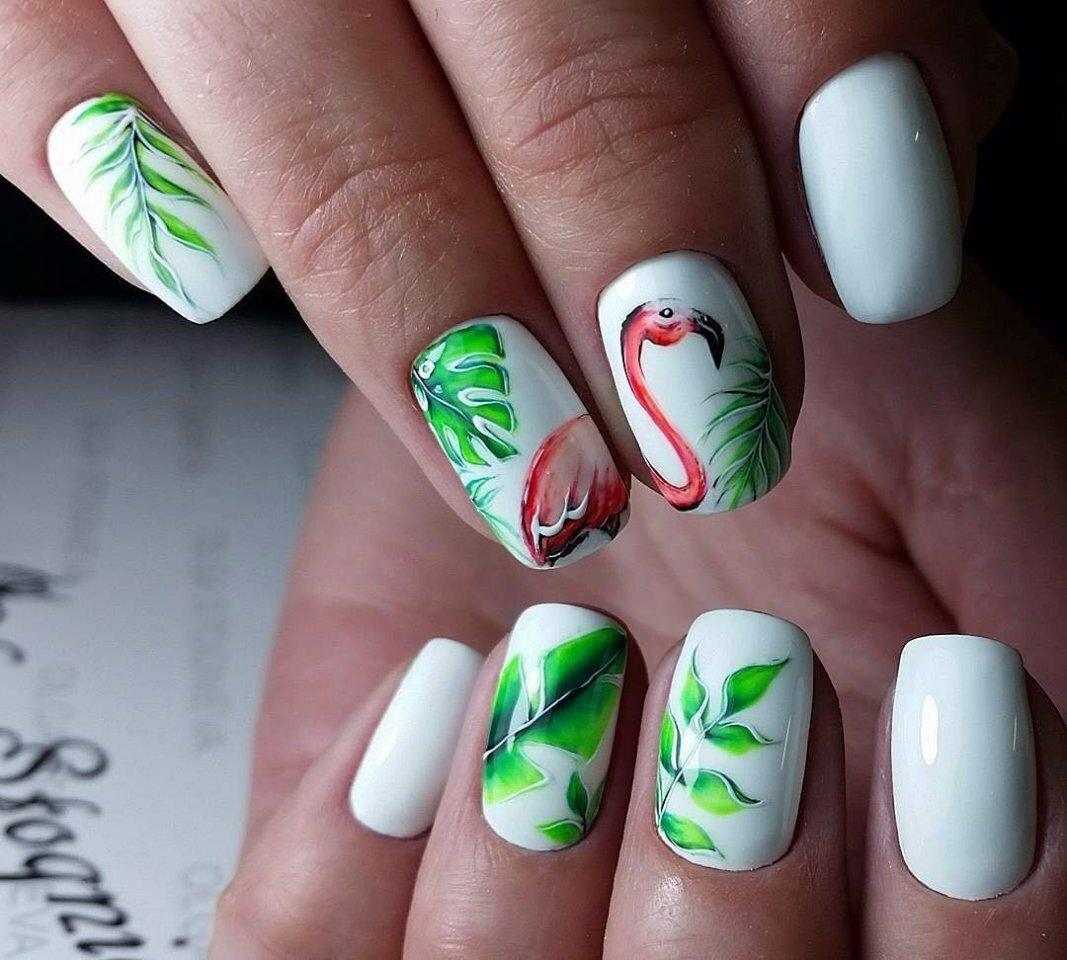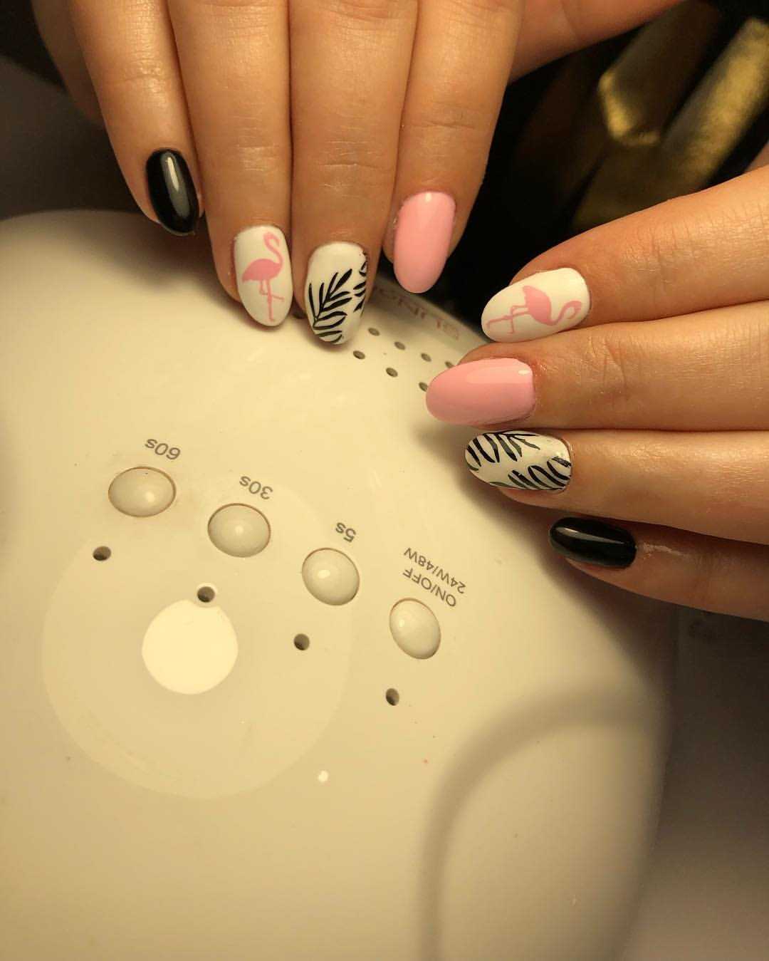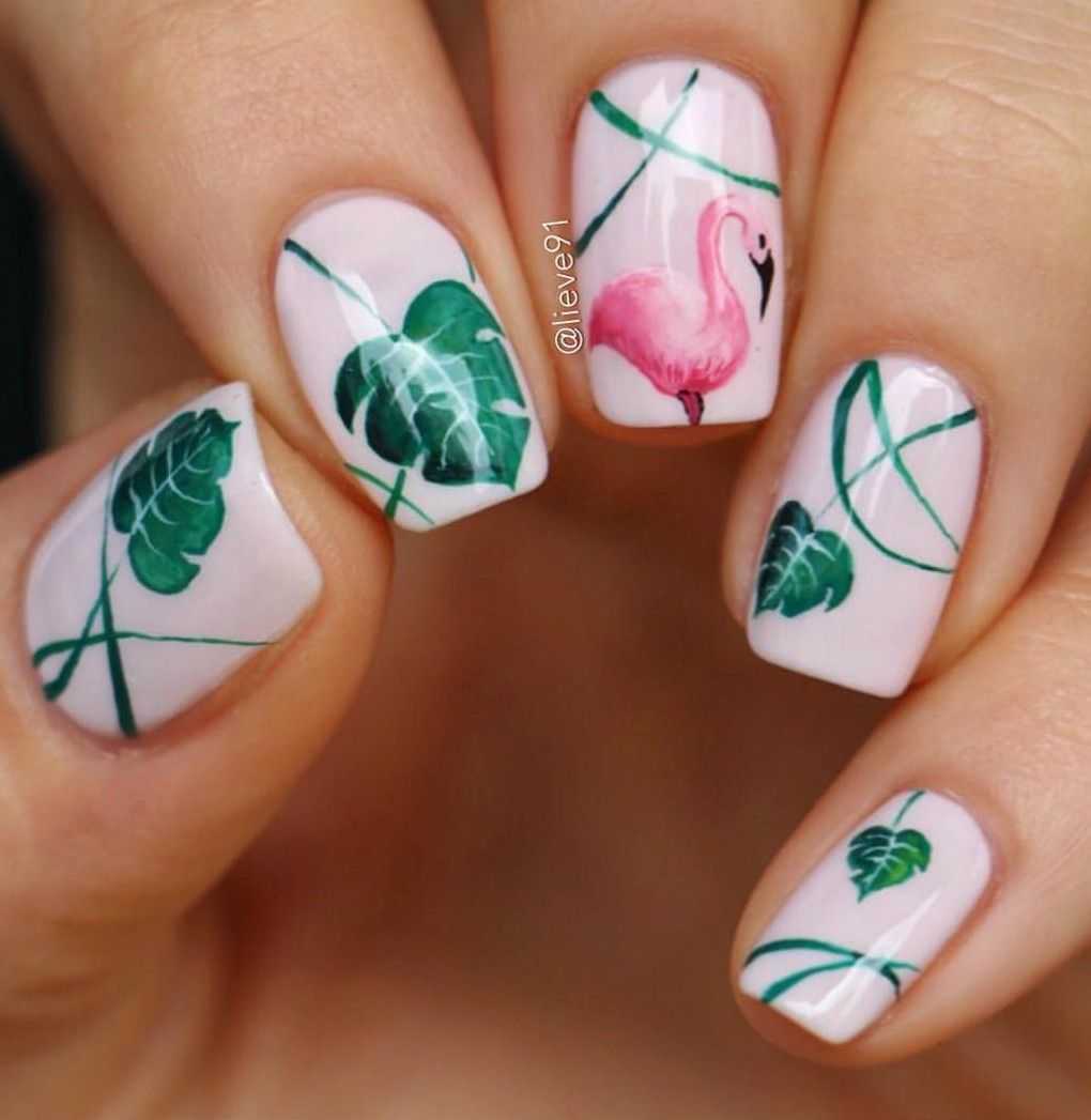 Не хотите отставать от моды? Тогда вам точно придется по вкусу маникюр с фламинго и листьями, который завоевал расположение самых стильных леди нашей планеты. Подобный узор чаще всего встречается в цвете, но не менее эффектно он будет смотреться, если выполнен в духе минимализма, где цветные узоры сменяются черными.