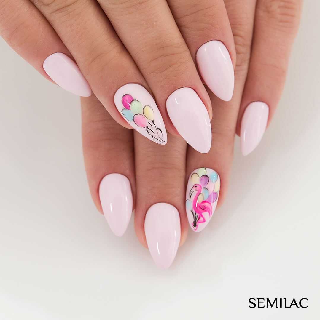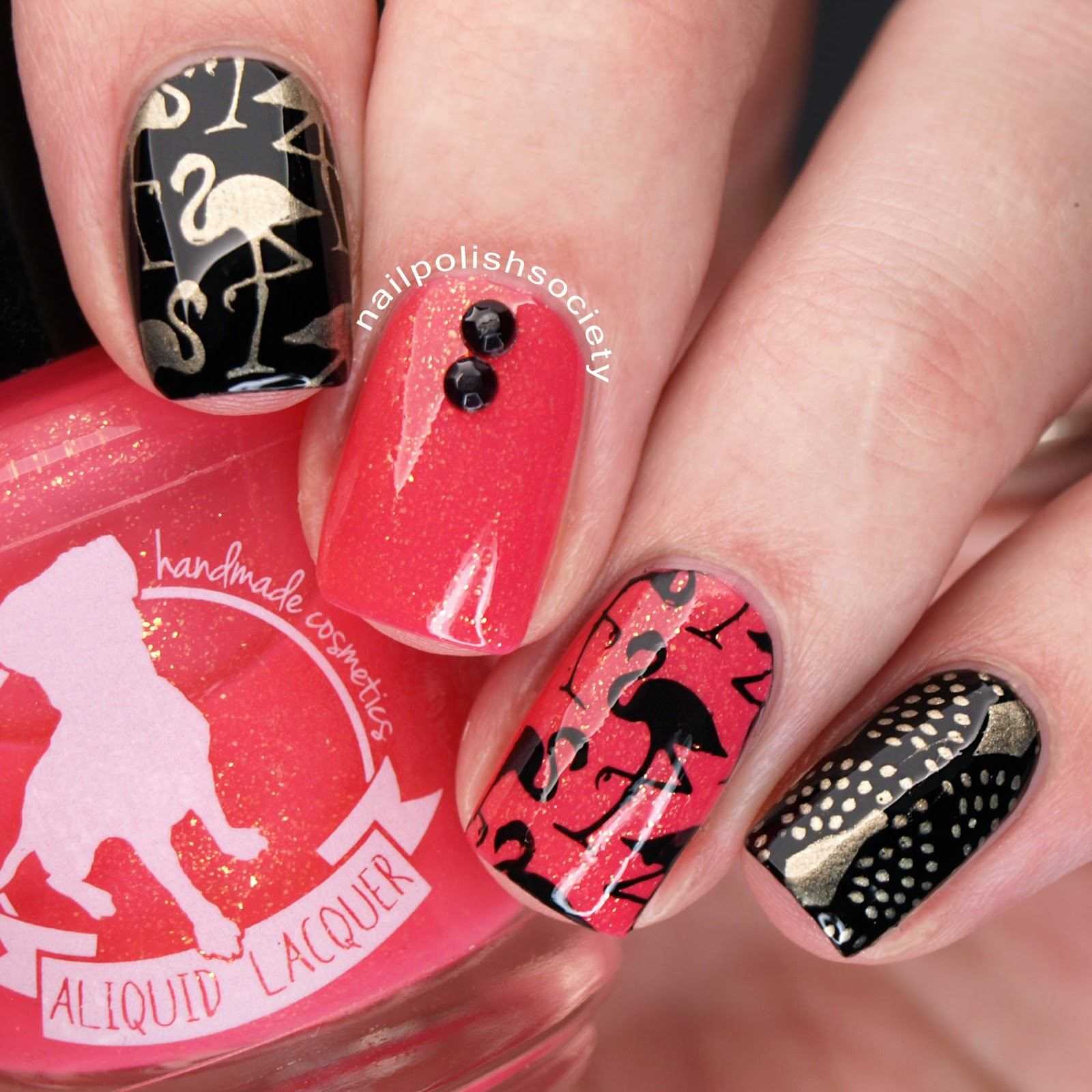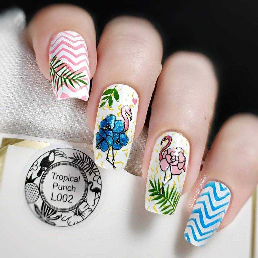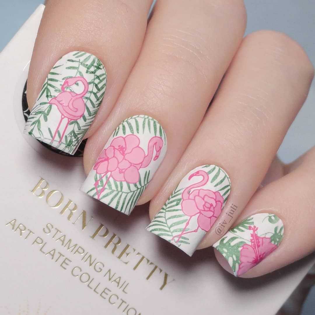 - стемпинг – узор переносится на поверхность ногтя с помощью штампика. Лучше всего узоры стемпингом выглядят в контрастном исполнении, например, темный рисунок фламинго на светлом фоне. Также можно использовать изображение стемпингом как основу для дальнейшей прорисовки узора.