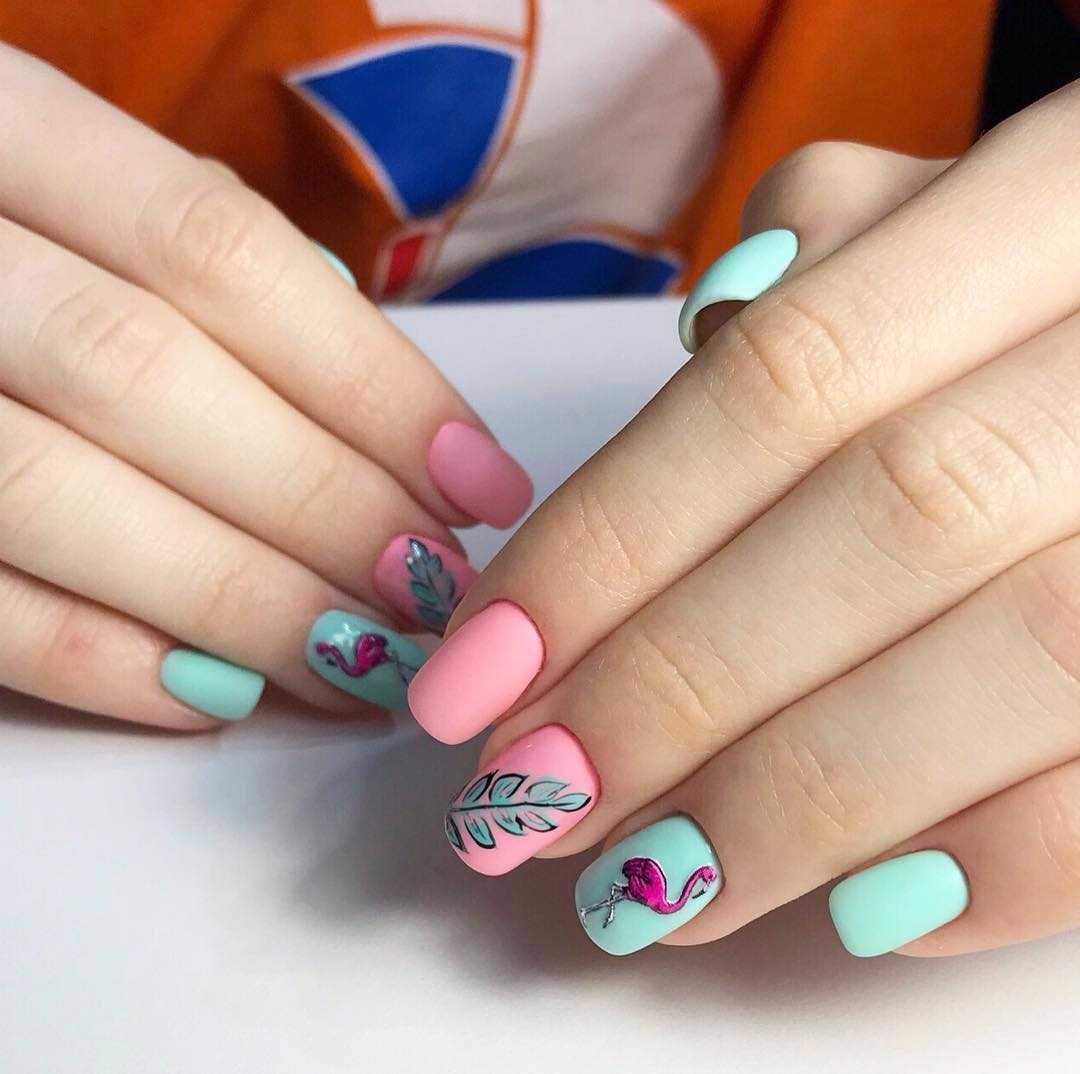 Дизайн ногтей с фламинго хорошо выглядит в такой цветовой палитре: