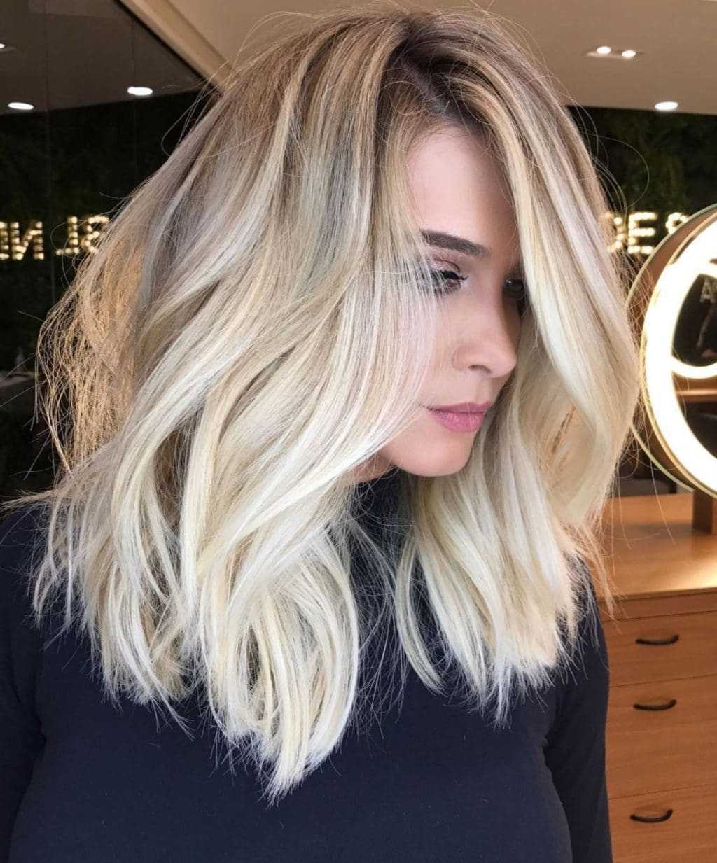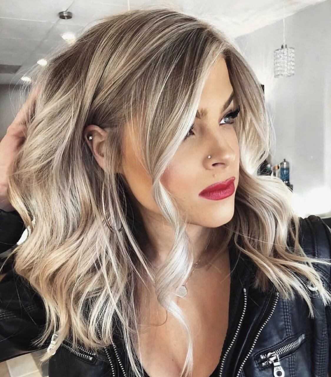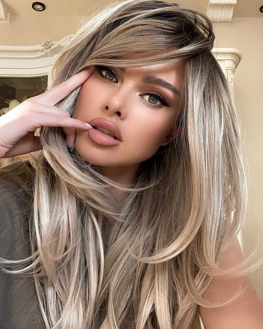 Это замечательный выбор на длинные волосы. Модное окрашивание волос блонд в холодных тонах в 2021 году делает образ незабываемым. При выборе платинового блонда можно смело выбирать брючные наряды, который будут прекрасно гармонировать с локонами.
