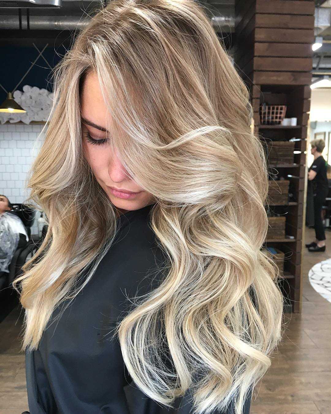 Востребован блонд в теплых тонах на длинные волосы. В 2021 году модное окрашивание волос получится прекрасно, если взять кремовый блонд. В результате такой процедуры получаются естественные светлые локоны.