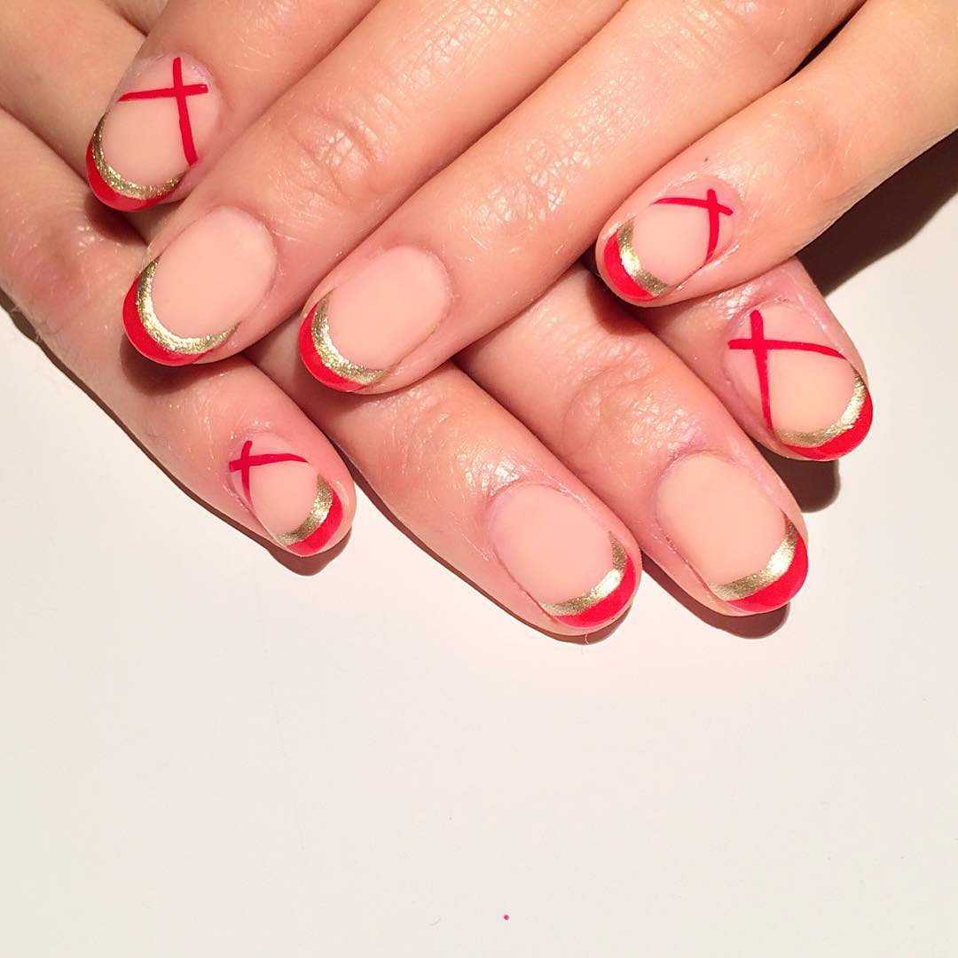 • геометрическая абстракция – довольно часто нынче используются ленточные полосы в виде тоненькой фольги, накладываемой в различных абстрактных пересечениях на ноготки; взятый за основу алый глянец будет служить отличным фоном для раскинутых по ногтевому пространству прямых золотых линий, пересекающихся под прямым углом и не только;• алый лунный – интересным дизайном считается прорисовка красным цветом основного покрытия (это может быть как мат, так и глянец) и выделение узорчатым рябым золотым манером улыбок обратного французского маникюра: полукруги роскошных золотых лунул с завитками смотрятся очень аристократично и элегантно;• золотые бульонки – отличным решением служит также выкладка в форме праздничных бантов из золотых бульонок на фоне бурого красного основного покрытия. Такой декор можно приукрасить эффектом со стразами: в серединку имитированного бульонистого банта или цветка всадить центральный камешек, который будет оттенять серединную часть декора и внесёт свою нарядную лепту в общий образ;• россыпь шиммера и глиттера – невероятно эффектно выглядят на красной основе рассыпанные в прикорневой зоне или, наоборот, в области среза блёстки в крупном или мелком своём напылении. Такой маникюр подойдёт для праздничной вечеринки или выхода в свет с обязательным использованием аксессуаров в подобной цветовой гамме.