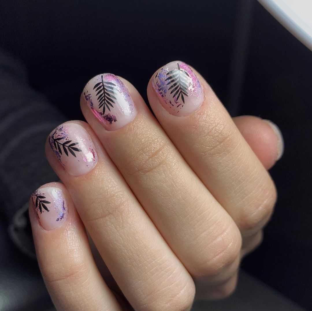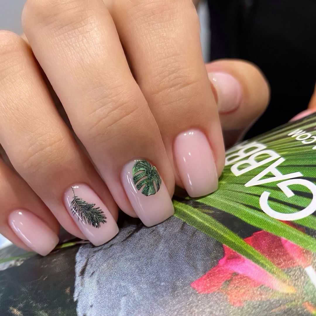 Маникюр с листьями чаще всего выполняется в технике френч или в лунном дизайне, когда листочки аккуратно помещаются в углу ногтевых пластин или полумесяцем. Пальмовые листья и листочки монстеры остаются топовыми рисунками для маникюра в тропическом стиле.