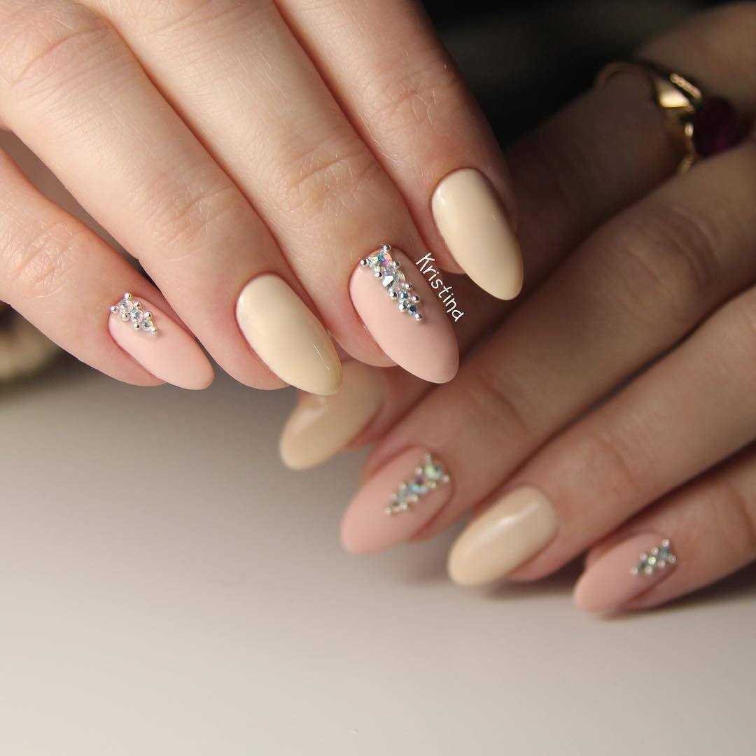 Нюдовые ноготки, да ещё и в компании с матовой структурой – это всегда максимально спокойно и лаконично, поэтому дизайнеры рекомендуют обязательно использовать в оформлении не только классические стразы, но и другие виды декора, например, металлизированные полоски, бусины, жемчужные полусферы и прочие материалы. Это могут быть всевозможные вариации дуги у основания нескольких ноготков, сложная композиция на безымянном пальчике или одиночные украшения на каждой ногтевой пластине. Всё зависит от вашего настроения и предпочтений. При этом для создания маникюра может использоваться как один, так и несколько нюдовых оттенков одновременно, а также белый, чёрный и другие цвета.
