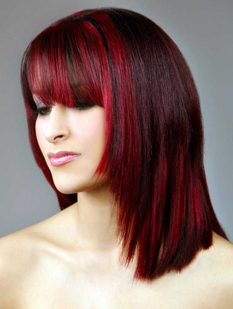 Покраска в красный цвет не травмирует структуру волос. Брюнеткам, желающим внести разнообразие в свою жизнь, темно-красные цвета подойдут идеально.