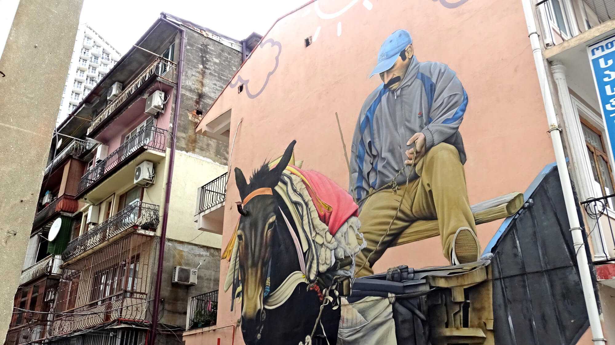 Граффити «Возничий». Красивое изображение аджарца и лошади на стене дома на улице Пиросмани.