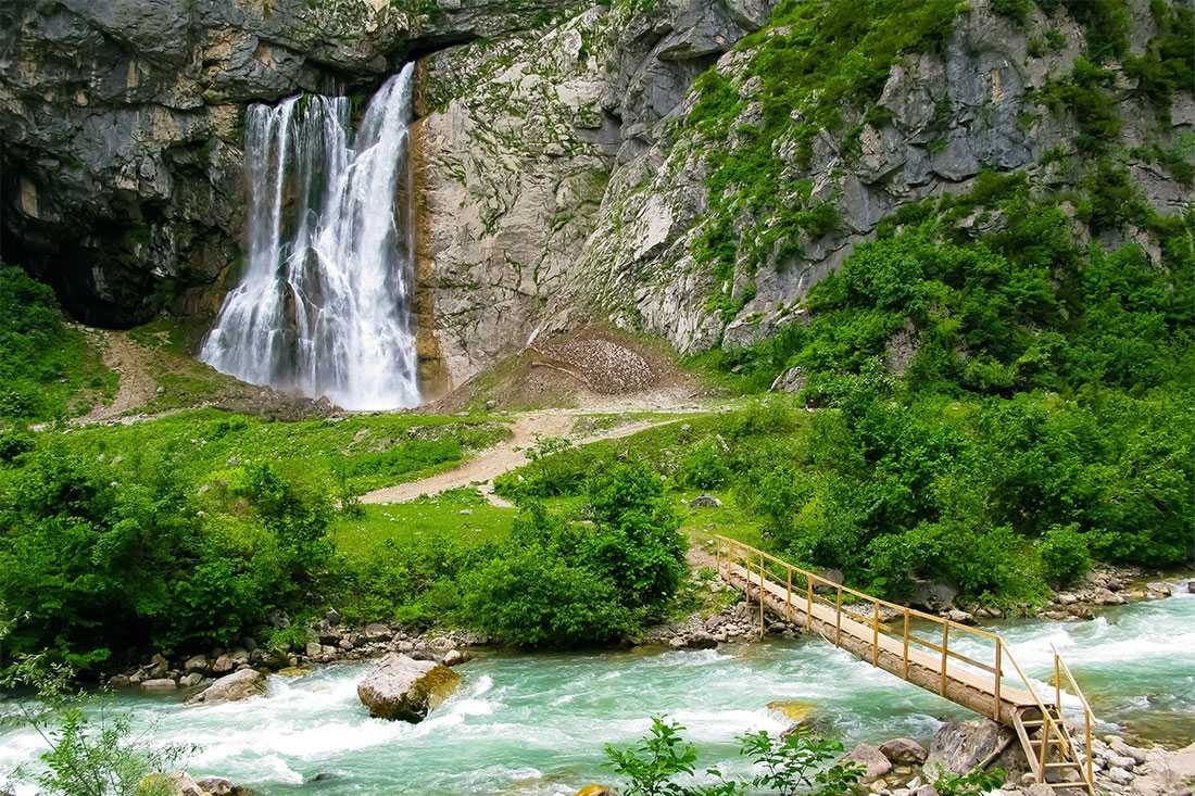 Величественный Гегский водопад входит в число самых зрелищных и посещаемых природных достопримечательностей Абхазии. Он находится в северной части Гагрского хребта – между горным массивом Арабика и Рицинским заповедником. Высота водопада варьирует от 50 до 70 м. Прежде чем с грохотом обрушиться вниз через узкую расщелину в отвесной скале, бурный речной поток проходит более 300 м под землей сквозь гроты карстовой Черкесской пещеры.