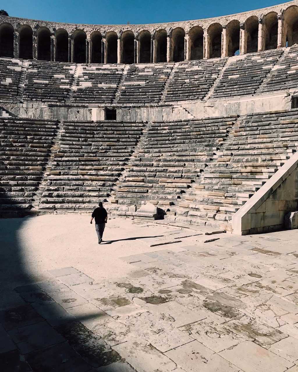 Древнеримский театр в Аспендосе, одном из крупнейших городов Памфилии в Античности, — самый хорошо сохранившийся «храм искусств» той эпохи в Малой Азии, если не во всём Средиземноморье. Правда, скульптуры с него сняли, и теперь они (кстати, тоже дошедшие до наших дней в отличном состоянии) экспонируются в Музее Антальи.