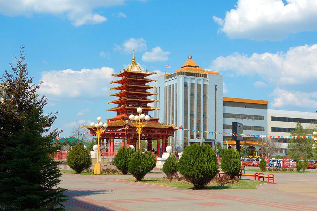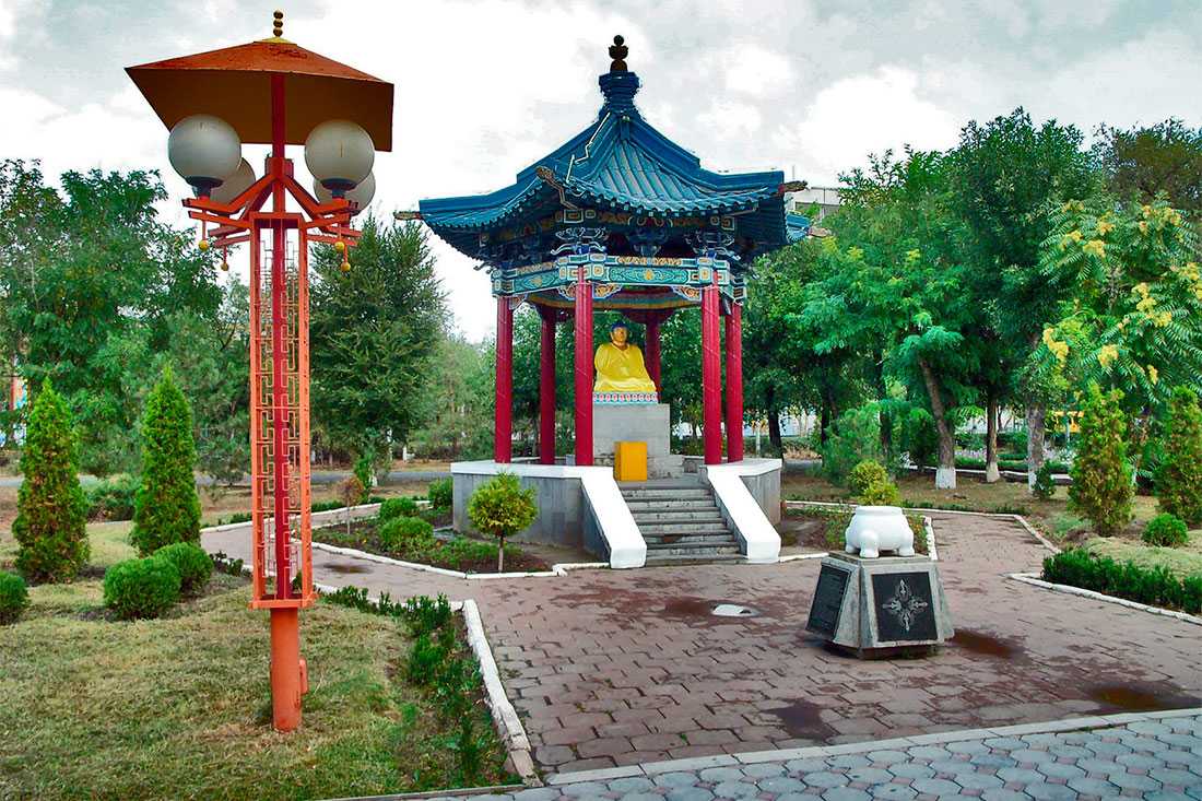 Памятник Ленину установлен в 1970 году. В 1995 году на аллее, которая ведёт к парку, возвели статую Будды Шакьямуни. В буддизме считается верхом неучтивости поворачиваться спиной к ламам, монахам и изображениям почитаемых учителей. Это правило распространяется и на памятники. Так как монумент Ленину смотрел в другую сторону, его развернули на 180 градусов.