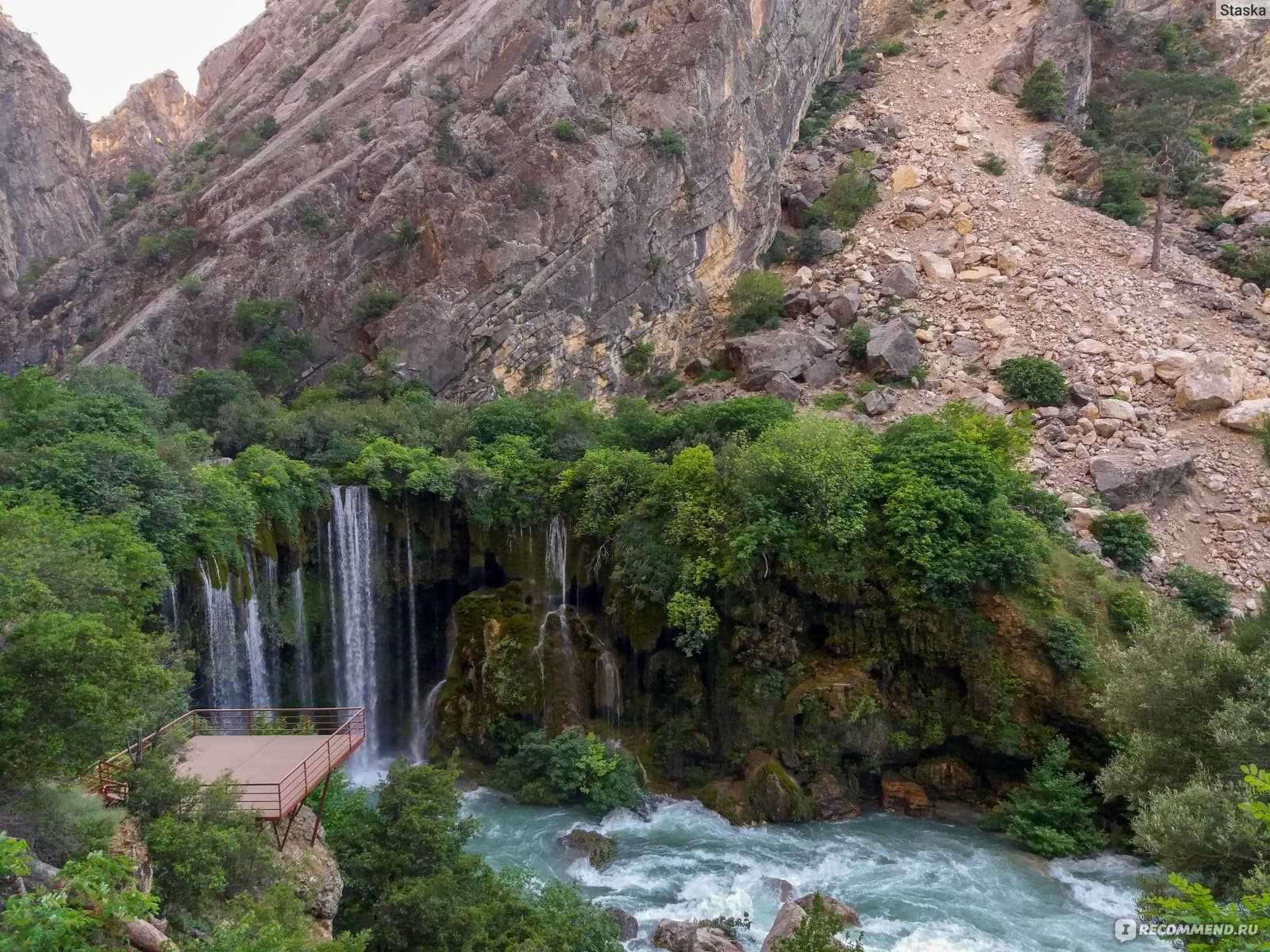 - Водопад Еркёпрю можно найти всего в 5 км от Мерсина в национальном парке Мут-Ерменек-Гюльнар. Название можно перевести как «мост из земли». Он образован водами сразу двух рек. Высота водопада около 30 метров, он стекает по отвесной скале, окруженный древними сталактитами. Рядом всегда прохладно и свежо. Посетить водопад можно самостоятельно, как и сам парк, в котором растут вековые сосны, олеандры, дубы, клены, инжир, гранат, очень старый можжевельник, возраст которого более 1000 лет. Правда, туристы здесь бывают редко, потому что Google прокладывает к нему неправильный маршрут. Чтобы добраться до водопада, нужно доехать вначале до Мута и дальше ехать по указателям на трассе, от трассы еще 9 км, оставить машину на парковке и идти пешком, довольно непростой путь, «серпантин для пешеходов». Вход 6 лир, на автомобиле -18 вне зависимости от количества пассажиров.