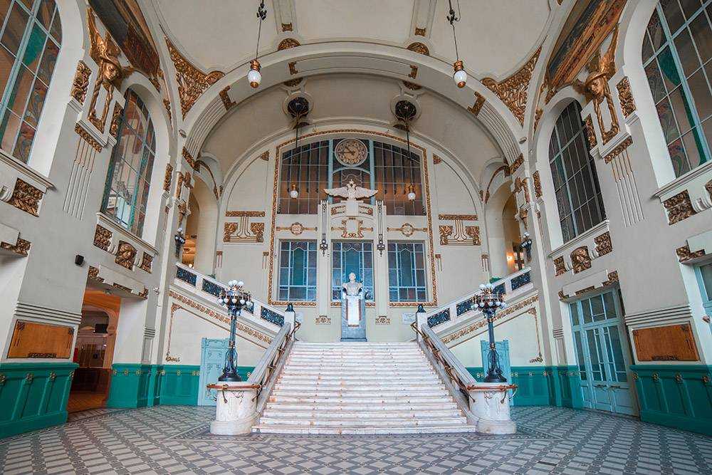 Витебский — самый старый вокзал в России. В 1837 году открылось его первое, деревянное, здание. Каменное, в стиле модерн, которое мы видим сегодня, было построено в 1904 году. Оно находится в списке объектов культурного наследия народов России и охраняется государством. Сохранился интерьер вестибюля: парадная лестница с мраморными перилами, витражи, лепные панно, старинные навигационные надписи «Выход».