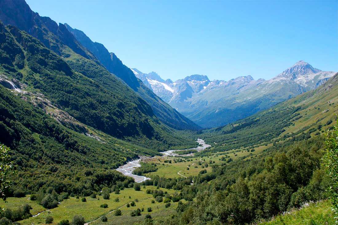 Ущелье, берущее свое начало на восточной окраине поселка Домбай, приведет вас к горе Домбай-Ульген – самой высокой точкой не только на Домбае, но и на всем Западном Кавказе. Название этого знаменитого четырехтысячника переводится с балкарского языка как «убитый зубр»: издалека гора действительно напоминает огромное поверженное животное. В любое время года вершина Домбай-Ульгена покрыта серебристой шапкой снегов. Воды, образующиеся при таянии ледников, покрывающих отроги горы, превращаются в реки и ручьи, наполняющие ущелье жизнью.