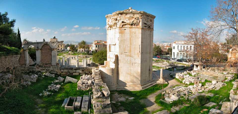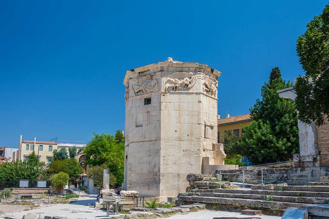На открытой и хорошо продуваемой агоре находится Башня Ветров. Здание из белого мрамора высотой 12 метров имеет форму правильного восьмиугольника, что соответствует 8 божественным ветрам. Другое название этого архитектурного памятника — «Часовая башня Андроника Киррского» или «Часы Кирриста». Андроник из Кирр был астрологом. По плану строение должно было возвышаться над городом так, чтоб флюгер, указывающий направление ветра, и солнечные часы на крыше были видны из любой его части. Кроме определения времени по солнцу, греки пользовались гидравлическим совершенно точным хронометром, находящимся внутри строения. Башня имела большое значение для горожан, так как являлась метеорологическим и астрологическим центром Афин.