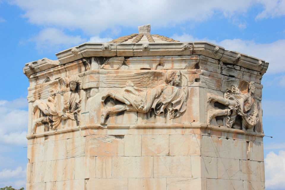 Восемь граней башни ориентированы по сторонам света, а ее верх опоясывает фриз с аллегорическими рельефными изображениями восьми ветров. Когда-то давно крышу Башни ветров венчал бронзовый флюгер в виде фигуры Тритона. Внутри этого сооружения находились водяные часы, снаружи – солнечные.