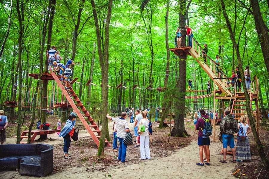 Современный комплекс развлечений в Светлогорске, где можно активно проводить время всей семьей, находится в лесном массиве. На территории комплекса, занимающей 2 гектара, создан веревочный парк с несколькими трассами, полоса препятствий, оборудованы две игровые площадки, а также построена лесная сцена. Гостей парка ждет увлекательная тематическая зона «Динозавры», где можно увидеть фигуры грозных доисторических животных, которые двигаются и издают устрашающие звуки. Радость самым юным посетителям тематического парка доставит мини-зоопарк, в котором можно купить корм и покормить животных.