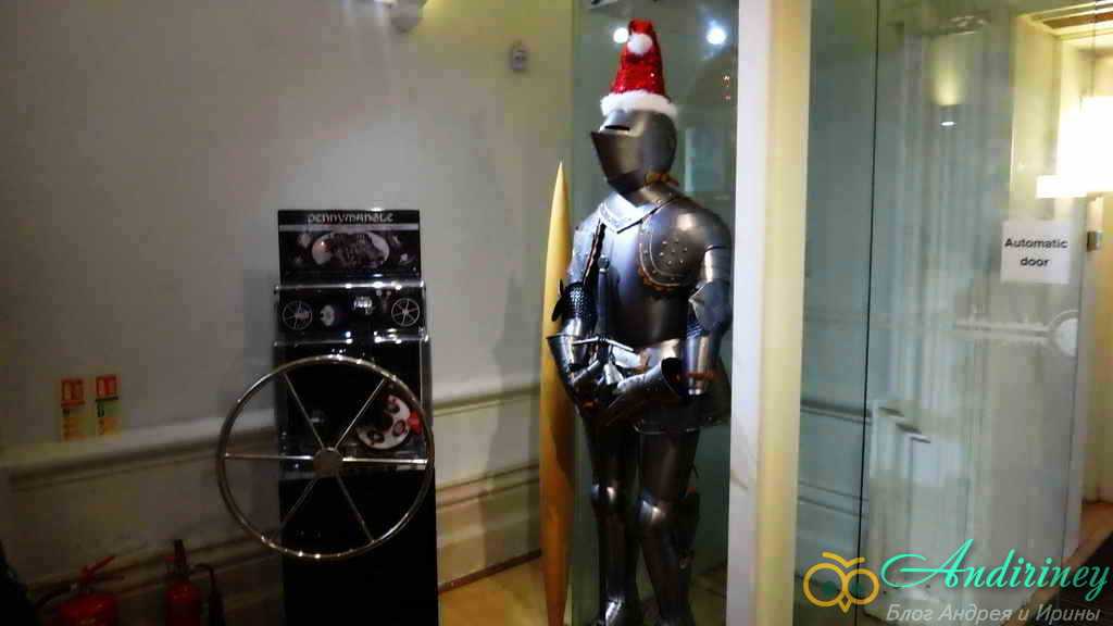 Сейчас в замке музей с богатой коллекцией экспонатов. Встречает гостей рыцарь. По случаю приближающегося Нового года, в Сантином колпаке.