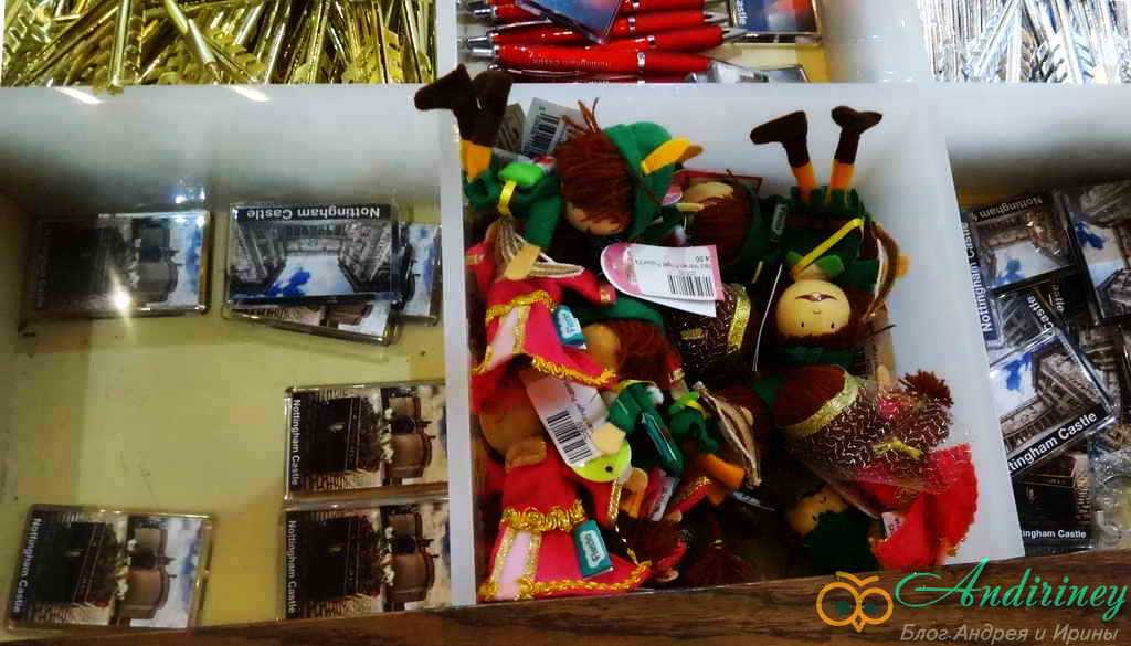 На выходе из музея — сувенирный магазин, где можно купить как маленьких Робин Гудов, так и зелёную курточку и шапочку лесного разбойника для участия в фестивале.