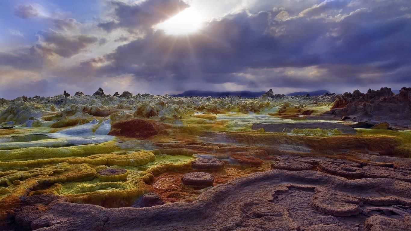 Следующий пункт назначения не слишком гостеприимен – это пустыня Данакиль с серными источниками и вулканами, температура воздуха здесь может достигать 50С. Лучшие виды на инопланетные пейзажи открываются с вулкана Даллол, а оптимальное время для посещения – декабрь-февраль, когда погода благоволит отважным путешественникам.