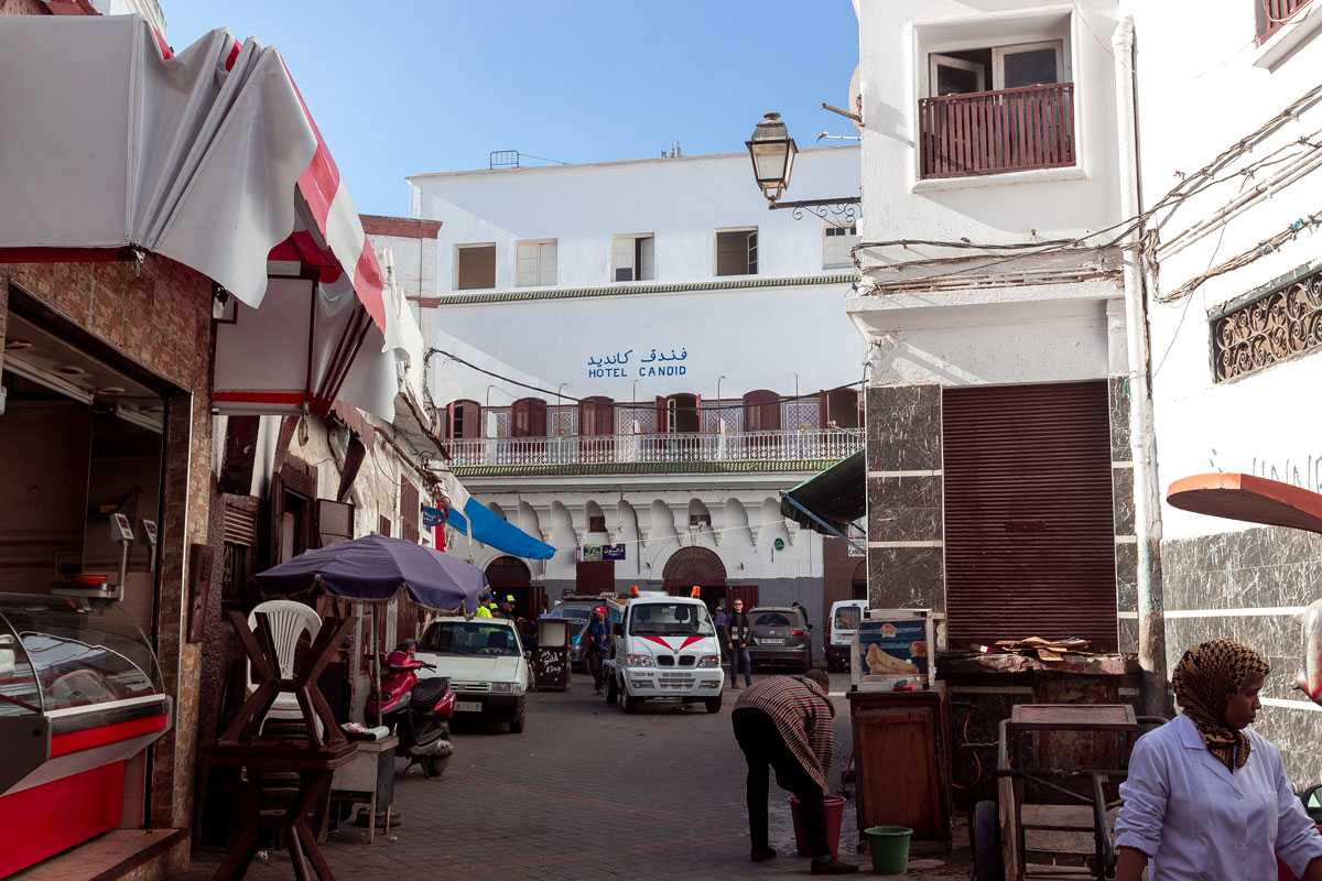 Среди базара находятся и отели, которые представляют собой типичные караван-сараи, одни из лучших на Востоке. Чаще всего отели — самые опрятные здания в медине. Стены их выкрашены белой краской, аккуратные надписи делают ярким синим или красным цветом, дублируя на двух языках.