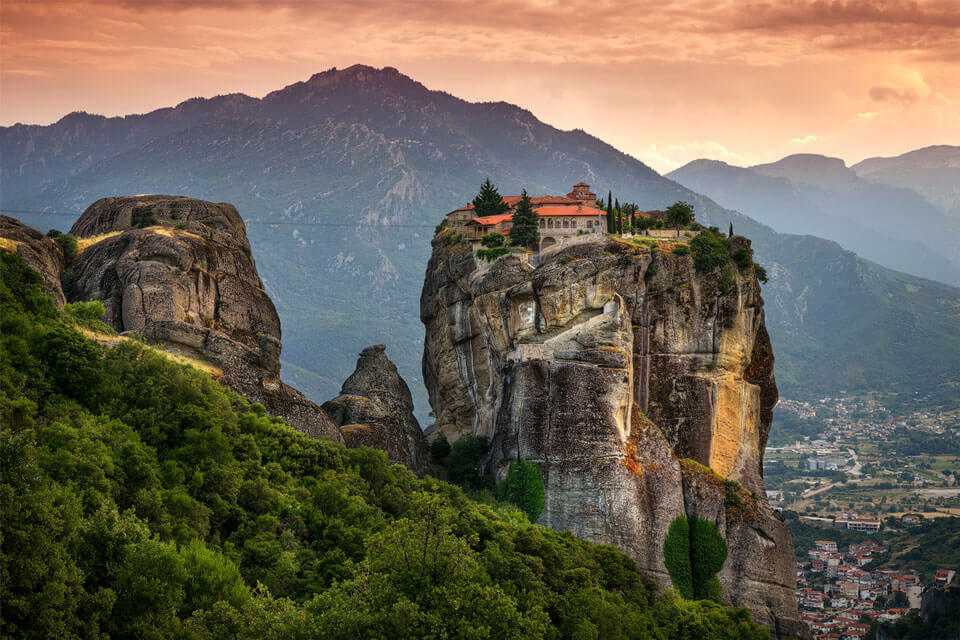 В популярной туристической области Греции – Фессалии есть феноменальные горные скалы, вертикальной громадой расположившиеся над г. Каламбака. Вызывает удивление их почти абсолютная перпендикулярность, но ещё больше поражает наличие на вершинах этих скал монастырей, воздвигнутых аскетическими монахами в 14 веке. Остаётся только предположить, каких усилий стоило строительство монастырей Метеоры в таких труднодоступных местах.