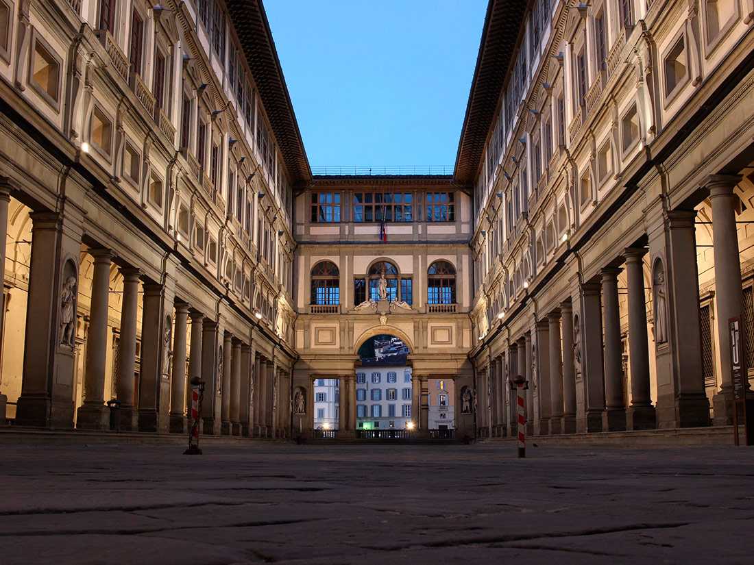 История: галерея была построена в XVI веке по заказу герцога Тосканы Козимо I Медичи, для её сооружения пришлось снести несколько старинных зданий. Козимо также попросил провести секретный коридор, соединяющий галерею с Палаццо Питти и Садами Боболи. Изначально здесь хранилась частная коллекция благородного семейства Медичи, а открыта для посещений галерея стала только в 1769 году.