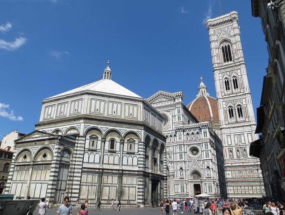 Построенный в XI веке баптистерий святого Иоанна Крестителя – одно из древнейших сооружений Флоренции. Облицовка стен выполнена из мраморных блоков зеленого и белого цвета, а с трех сторон здание украшают великолепные бронзовые двери. Самыми знаменитыми из них считаются восточные «Врата рая» – подлинный шедевр, созданный талантливым скульптором Лоренцо Гиберти. Оригинальные панели этих ворот хранятся в музее Дуомо.