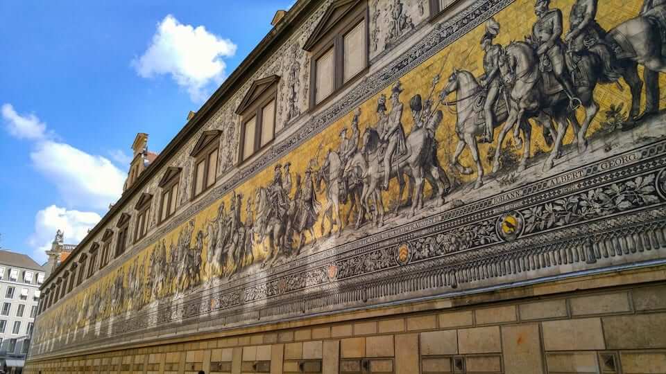 Это масштабное произведение искусства неизменно привлекает восхищенные взгляды туристов. И это неудивительно — фарфоровая композиция простирается на 100 метров, в высоту почти достигает 10 метров. Для ее создания понадобилось изготовить около 25 тысяч плиток и уложить их особым бесшовным способом. Создано самое большое в мире панно в начале XX века, его сюжет показывает представителей княжеской династии Веттинов, которые в течение тысячи лет правили Саксонией. Их сопровождают ученые, ремесленники, представители искусства, крестьяне, солдаты и дети.