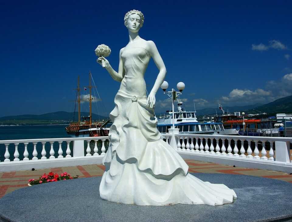 Белая невеста – популярное место не только у молодоженов, но и гостей курорта. Около скульптуры получаются отличные фотографии: чтобы сделать фото, приходится ждать. Белая невеста появилась в городе в 2010 году, а создали ее петербуржцы Поляков и Соколов. Статуя отлита из бронзы и покрыта белилами уникального состава: их снежный цвет не меняется от солнца и соленого морского ветра. Невеста имеет более 2 м высоты, а масса статуи более 2 т. Для сооружения потребовался постамент из гранита. Он имеет 3 ступени.