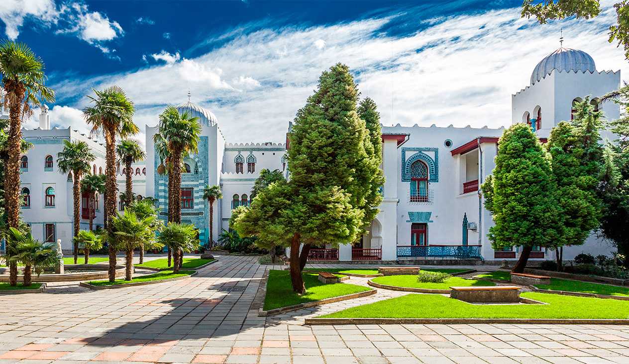 Его белоснежные стены украшены сине-голубыми восточными орнаментами, а над ними возвышаются серебристые купола. Дворцовый комплекс окружен роскошным парком с пальмовыми аллеями, фонтанами, скульптурами, беседками и бассейнами. Здесь также имеется собственный ботанический сад. В настоящее время в здании дворца размещен санаторий.