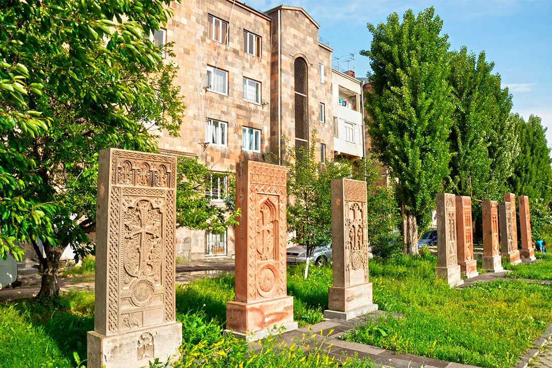 «Крест-камни», установленные в гюмрийском сквере, – это воссозданные копии некоторых хачкаров, разрушенных на средневековом армянском кладбище в Джульфе – древнем городе, ныне находящемся на территории Азербайджана. Прогуляйтесь по скверу и убедитесь, что все стоящие там хачкары выдержаны в одном стиле, но при этом имеют уникальные узоры и выполнены так мастерски, что глаз не оторвать.
