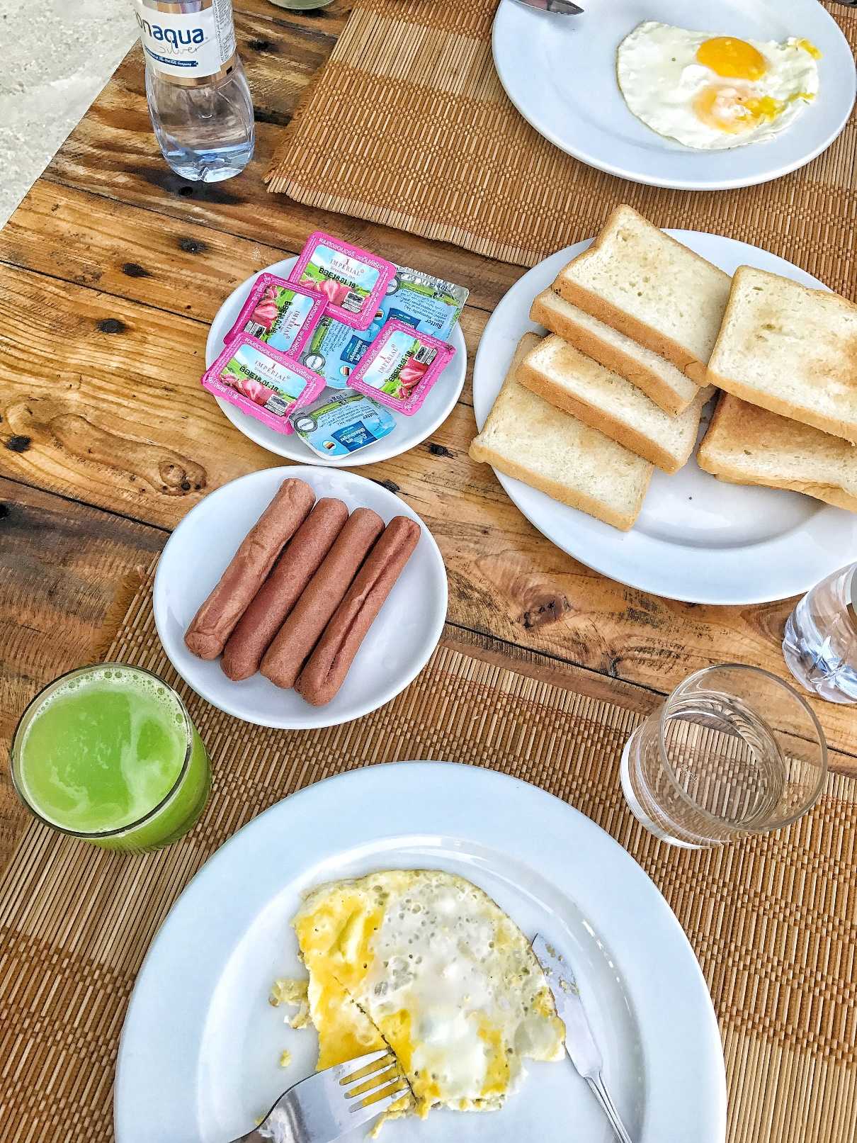 А на утро нас на берегу океана ожидал необычный завтрак. На Мальдивах есть такая особенность каждое утро подавать «мальдивские завтраки Mas Hun», которые включают в себя опять-таки тунец, посыпанный кокосом, сосиски, яйца и сок.