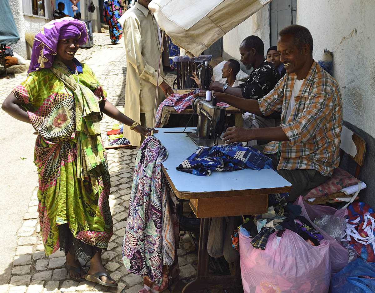 На последнем снимке, наконец, показалась еще одна достопримечательность Харэра — мужчины-швеи, сидящие на теневой стороне улочки или под примитивным навесом за старинными, в основном, зингеровскими машинками с ножным приводом, шьющие всякий мелкий ширпотреб для местных магазинов и оптовиков. Их множество, и эта картина старого ремесла остается в сердце навсегда:
