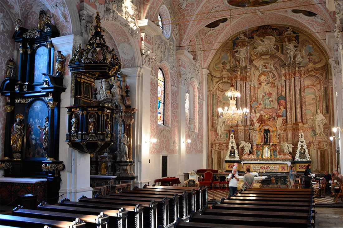 Эта католическая церковь неоднократно перестраивалась и приобрела элементы готических дополнений, расположенных главным образом в ее южном портале. Его украшает 15 деревянных скульптур, изображающих Иосифа, Богородицу с младенцем на руках и 12 апостолов. В полдень каждой субботы и воскресенья (с апреля по октябрь) возле церкви проводится церемония смены караула.