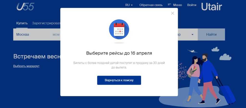 С 17 марта компания Utair ввела ограничение на продажу билетов. Теперь купить или забронировать билет можно максимум за 30 дней до вылета.
