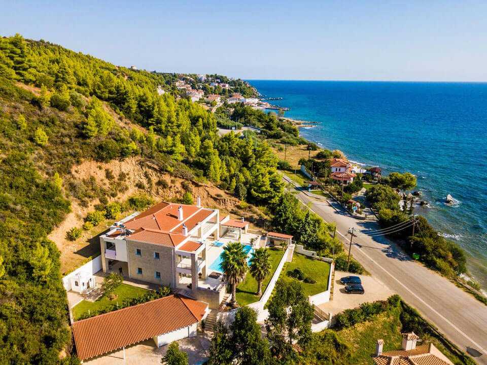 Пляж отличается превосходными видами. Прозрачная бирюзовая вода, белый песок, берег, окаймленный зеленью и пейзаж со знаменитой горой Афон привлекают множество туристов. Вход в воду пологий, но, пройдя всего несколько метров, можно попасть на глубокое место. Очень понравится пляж дайверам — скалы спускаются уступами и под водой представляют собой завораживающее зрелище.